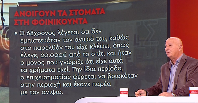Και ιδιαίτερα αν το κίνητρο ήταν τελικά μία “παρανόηση” για τη τελική διαθήκη του 68χρονου θύματος. Με απλά λόγια, αν κάποιος πίστευε ότι ο 68χρονος δε τον συμπεριλάμβανε στην τελευταία διαθήκη ή ότι άφηνε την “μερίδα του λέοντος” κάπου αλλού, μήπως αυτό ήταν το κίνητρο που οδήγησε στη δολοφονία τόσο του 68χρονου όσο και του επιστάτη;