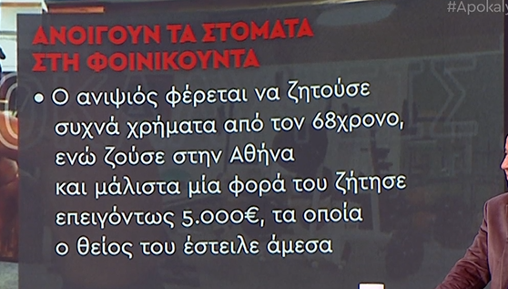Επίσης σύμφωνα και πάλι με μαρτυρίες, ο ανιψιός που ζούσε στην Αθήνα ζητούσε συχνά χρήματα από τον θείο του. Υπήρξε ένα περιστατικό, όπου ο ανιψιός ζήτησε 5.000 ευρώ γιατί υπήρχε ανάγκη (χωρίς να διευκρινίζεται τι είδος ανάγκη) και ο 68χρονος του έστειλε το ποσό άμεσα.