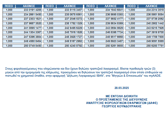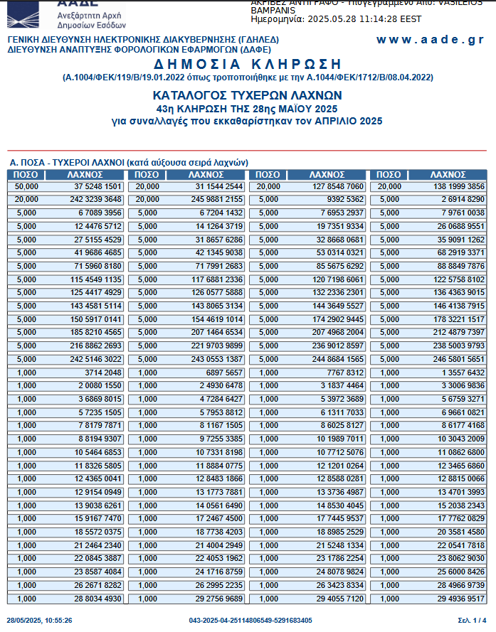 Πραγματοποιήθηκε η κλήρωση της φορολοταρίας για τον μήνα Απρίλιο 2025 από την Ανεξάρτητη Αρχή Δημοσίων Εσόδων (ΑΑΔΕ).
