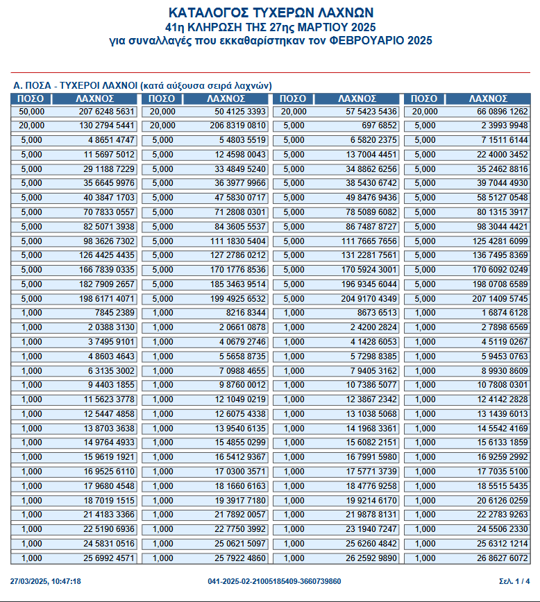 Ολοκληρώθηκε η 41η δημόσια κλήρωση της φορολοταρίας για τις συναλλαγές του Φεβρουαρίου, σύμφωνα με την ΑΑΔΕ.
