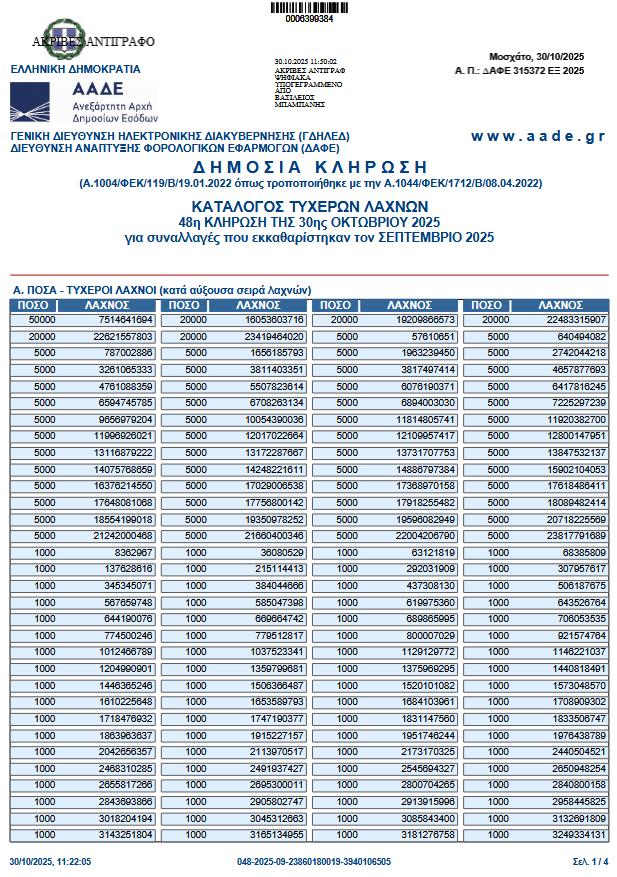 Ολοκληρώθηκε η φορολοταρία Σεπτεμβρίου από την ΑΑΔΕ σήμερα Πέμπτη (30/10). Οι συναλλαγές αφορούν συναλλαγές που έγιναν κατά το μήνα Αύγουστο 2025 και εκκαθαρίστηκαν το Σεπτέμβριο του 2025.