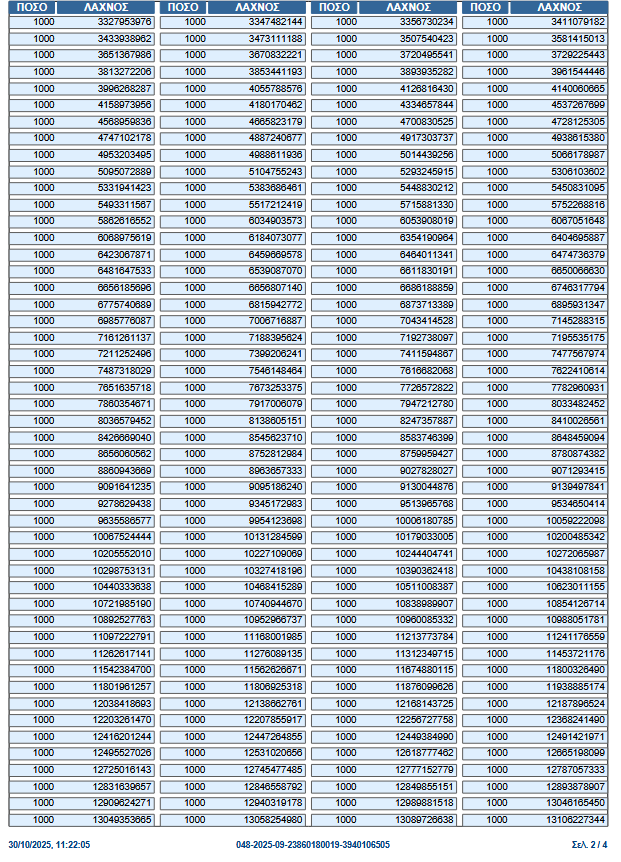 Ακολουθούν οι πίνακες της ΑΑΔΕ με τους τυχερούς λαχνούς της φορολοταρίας.