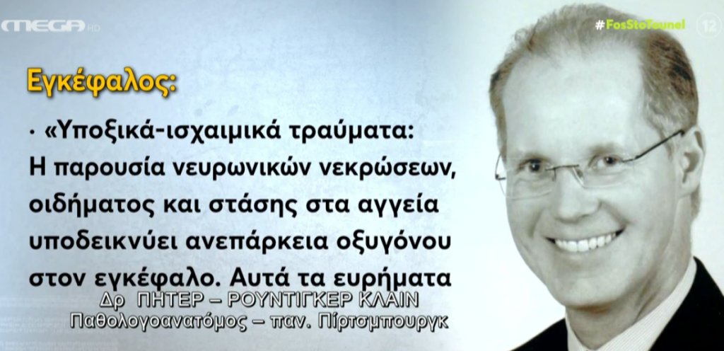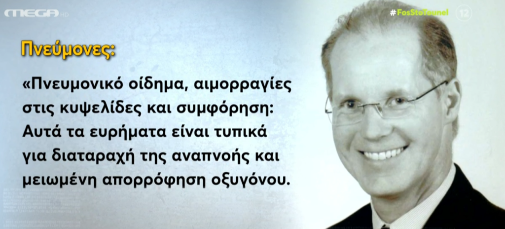 “Επιβεβαιώνεται η εικόνα κυρίως στα όργανα ότι είναι απόλυτα συμβατή με ασφυξία. Η εμφάνιση των λεμφοκυττάρων, που έχουν αναφερθεί, δηλώνουν ότι υποφέρει ο οργανισμός, ζορίζεται από έλλειψη οξυγόνου”.