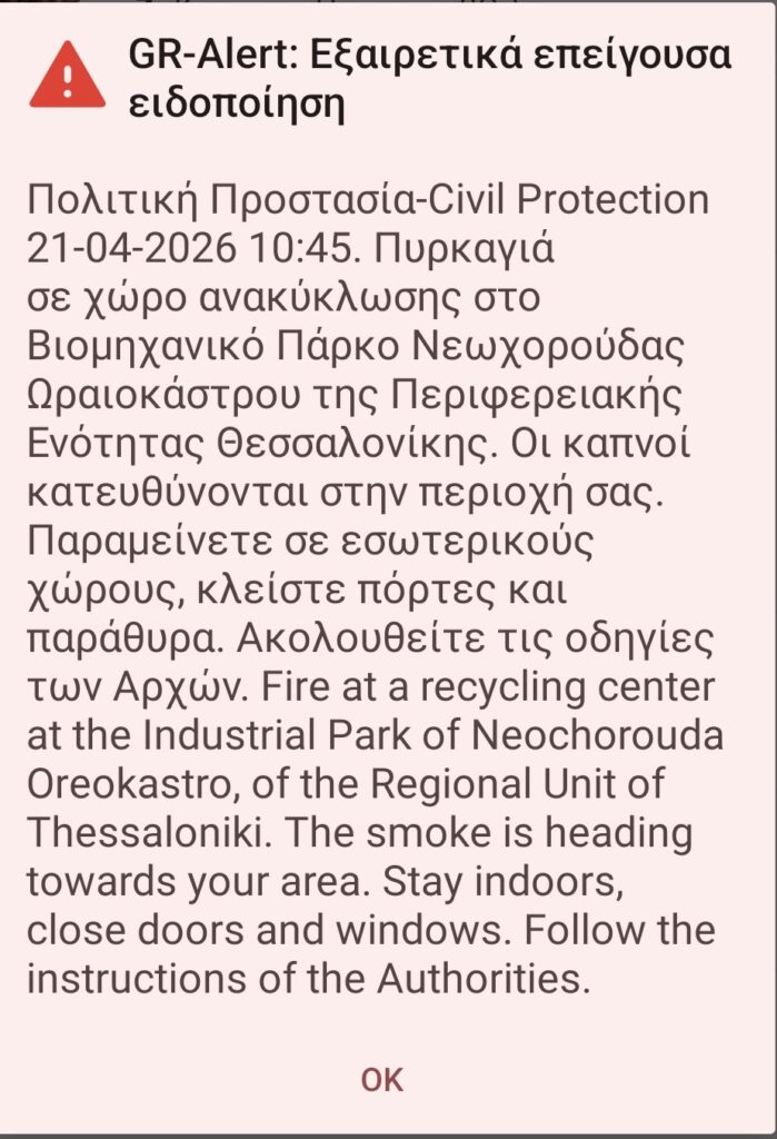 Hχησε το 112 για τους κάτοικους της δυτικής Θεσσαλονίκης δίνοντας οδηγίες για την πρόληψη σχετικά με τους καπνούς από την πυρκαγιά.