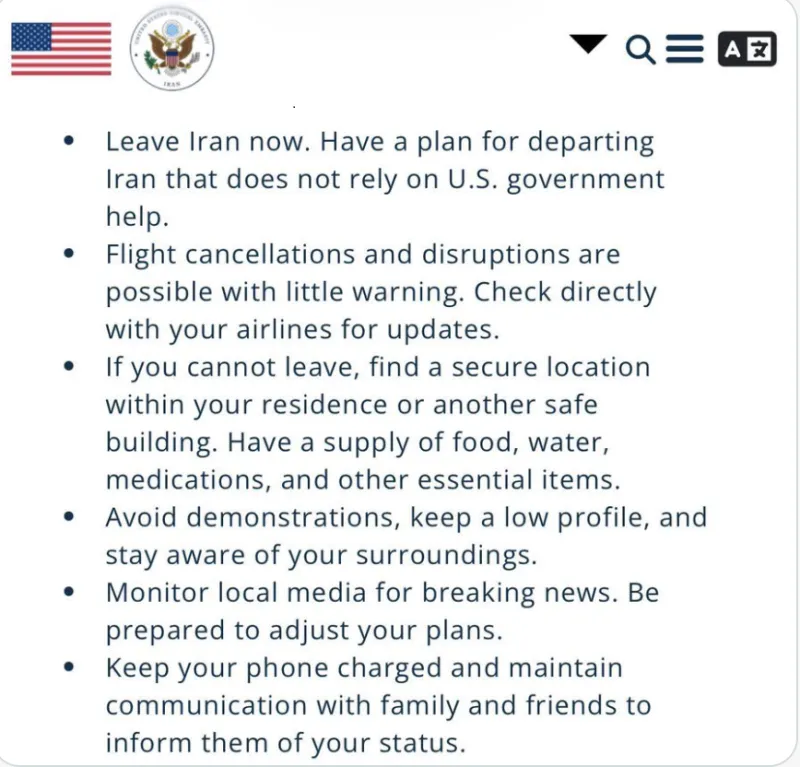 Σύμφωνα με security alert που εξέδωσε η Εικονική Πρεσβεία των ΗΠΑ στο Ιράν (U.S. Virtual Embassy Iran) τα ξημερώματα της 6ης Φεβρουαρίου 2026, οι Αμερικανοί πρέπει να έχουν άμεσο σχέδιο αναχώρησης που δεν εξαρτάται από βοήθεια της Ουάσινγκτον. Οι λόγοι περιλαμβάνουν συνεχιζόμενες διακοπές internet, ακυρώσεις πτήσεων, οδικούς αποκλεισμούς, διαταραχές στις μεταφορές και υψηλό κίνδυνο σύλληψης – ιδιαίτερα για διπλής υπηκοότητας (ΗΠΑ-Ιράν), που αντιμετωπίζονται αποκλειστικά ως Ιρανοί πολίτες.