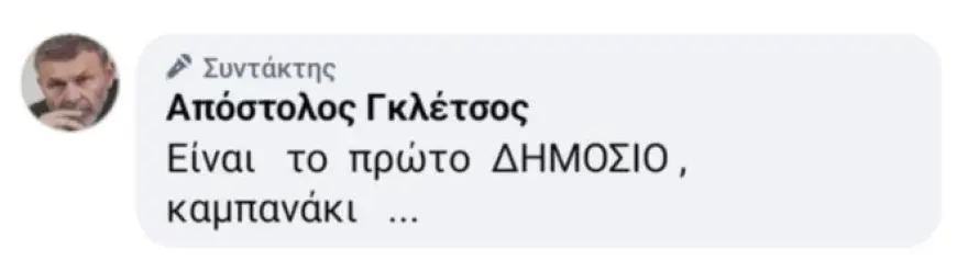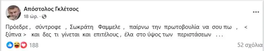 Σε μία …διαφορετική ανάρτηση με αποδέκτη τον Σωκράτη Φάμελλο προχώρησε ο Απόστολος Γκλέτσος, συνυποψήφιος του προέδρου του ΣΥΡΙΖΑ στην πρόσφατη εσωκομματική εκλογική κούρσα.
