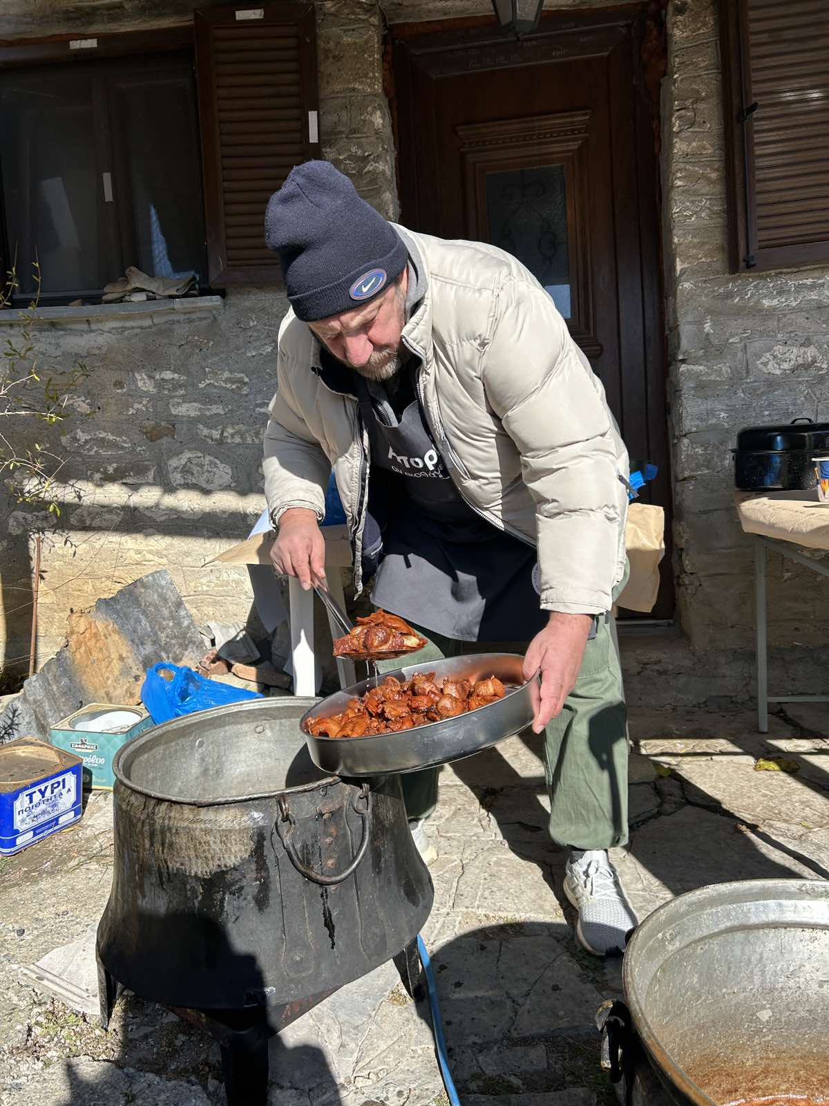 Από νωρίς το πρωί, στην ηλιόλουστη πλατεία του χωριού, άναψαν οι φωτιές από ξύλα και στήθηκαν πάνω τα τσουκάλια, όπου μέσα θα μαγειρεύονταν παραδοσιακά οι τσιγαρίδες, δηλαδή κομμάτια χοιρινού κρέατος με ψαχνό και λίπος. Να σημειωθεί ότι οι τσιγαρίδες διανέμονται δωρεάν κάθε χρόνο από τον Σύλλογο.