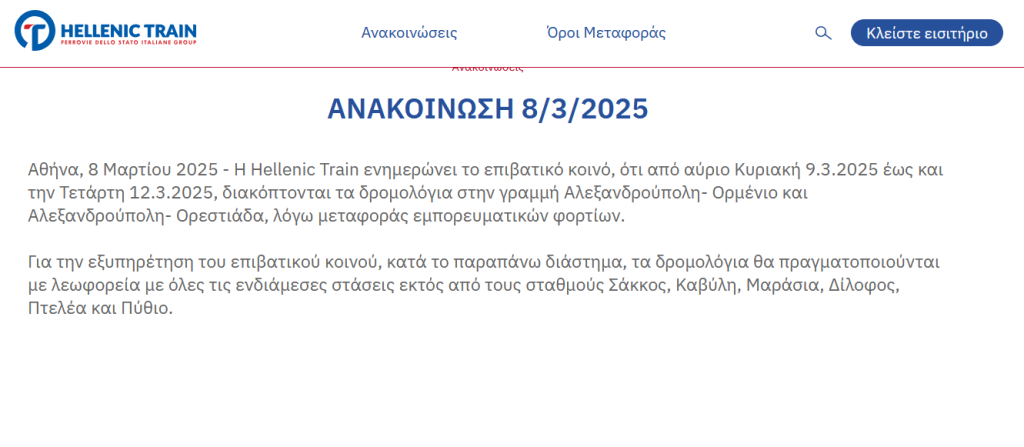 Διακόπτονται από αύριο, Κυριακή 9 Μαρτίου, έως την Τετάρτη 12 Μαρτίου, τα δρομολόγια στη γραμμή Αλεξανδρούπολη-Ορμένιο και Αλεξανδρούπολη-Ορεστιάδα, λόγω μεταφοράς εμπορευματικών φορτίων.