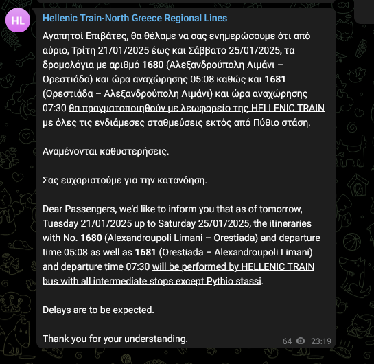Για την εξυπηρέτηση του επιβατικού κοινού τα δρομολόγια θα πραγματοποιούνται με λεωφορεία, ενώ η διακοπή των δρομολογίων με το τρένο θα διαρκέσει έως το Σάββατο 25 Ιανουαρίου.