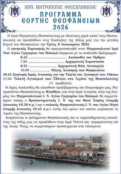 Με ιδιαίτερη χαρά καλούνται οι Θεσσαλονικείς να προσέλθουν στις Εκκλησίες της Πόλης μας για την μεγάλη Εορτή των Θεοφανείων την προσεχή Τρίτη 6 Ιανουαρίου 2026.