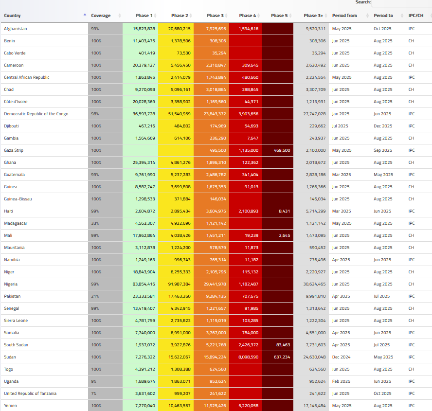 Με βάση τα στοιχεία της IPC, στη Γάζα «ο υποσιτισμός αυξήθηκε ραγδαία κατά το πρώτο δεκαπενθήμερο του Ιουλίου 2025. Πάνω από 20.000 παιδιά έχουν εισαχθεί για θεραπεία για οξύ υποσιτισμό μεταξύ Απριλίου και μέσα Ιουλίου, με περισσότερα από 3.000 σοβαρά υποσιτισμένα. Τα νοσοκομεία έχουν αναφέρει ραγδαία αύξηση των θανάτων παιδιών κάτω των πέντε ετών που σχετίζονται με την πείνα, με τουλάχιστον 16 αναφερόμενους θανάτους από τις 17 Ιουλίου».