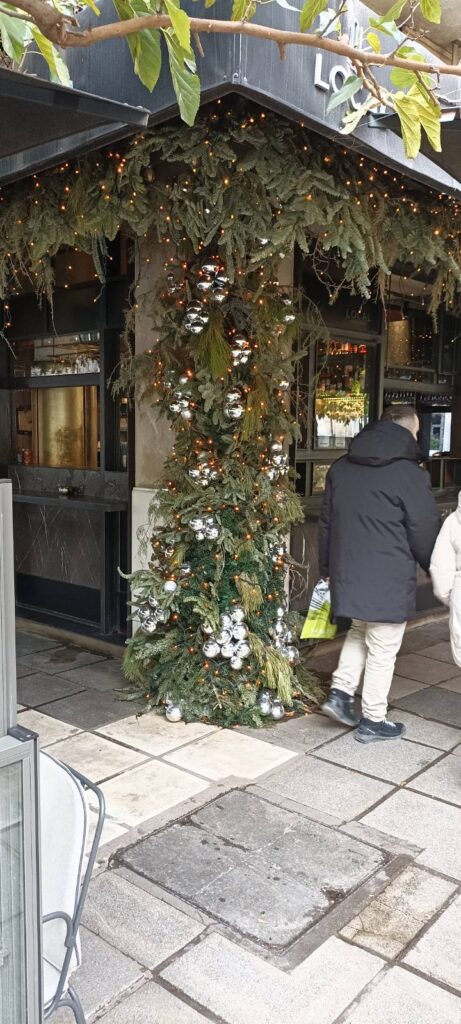 ⌈ Continuing our walk along the pedestrian street of Agia Sophia, we turned onto Agia Theodora to reach V. Irakliou Street. Opposite Odeon Square, two huge Christmas trees dominate, while a little further on, after the height of Aristotelous Street, we saw bitter orange trees (if they are any other citrus tree, forgive us!) decorated with Christmas decorations, among the orange fruits!⌋