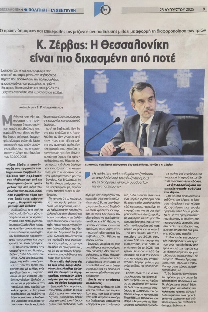 Κύριε Ζέρβα, θεωρείτε ότι η επανέναρξη των εργασιών του Δημοτικού Συμβουλίου βρίσκει την παράταξή σας «λαβωμένη» από τις διαφοροποιήσεις τριών μελών της στο θέμα του δανείου των 30.000.000€, που εγκρίθηκε χάρη και στις δικές τους ψήφους παρά τη διαφωνία της δημοτικής σας ομάδας;
