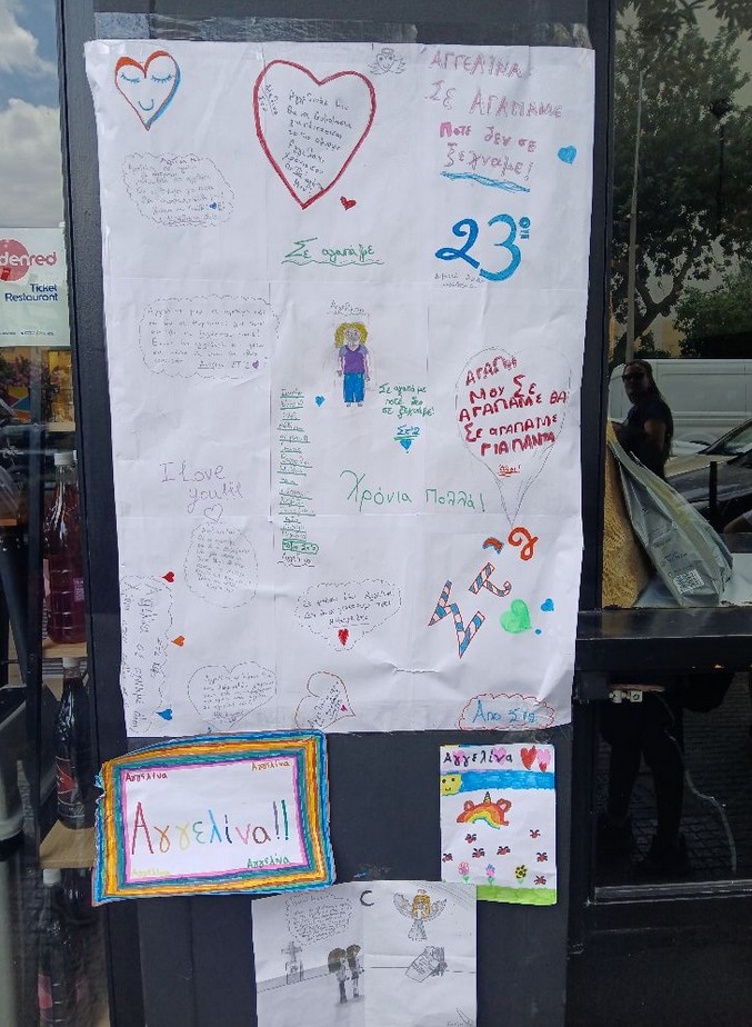 Οι συμμαθητές σχημάτισαν στο προαύλιο του σχολείου το όνομα της Αγγελίνας με τις τσάντες τους ενώ έφτιαξαν και ζωγραφιές με μηνύματα αγάπης για το μικρό κορίτσι.