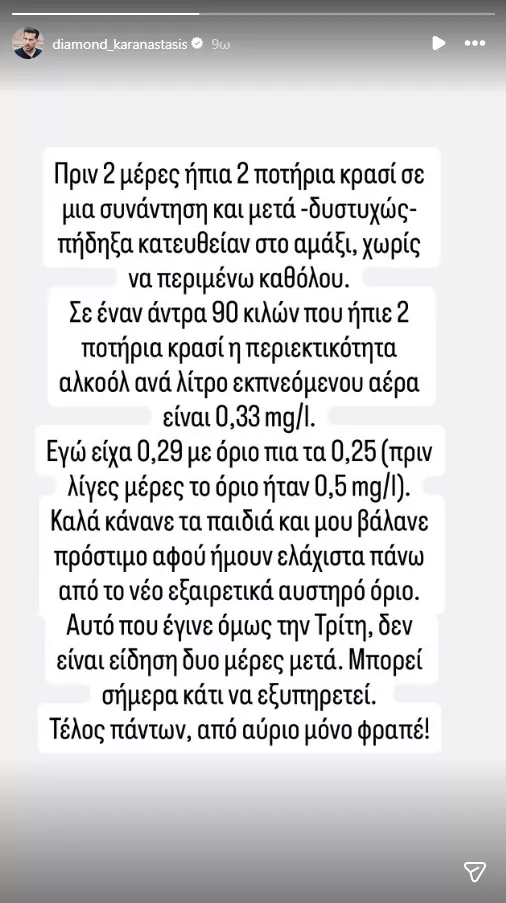 Ο ηθοποιός μέσω Instagram story αναφέρθηκε στο περιστατικό και εξήγησε τι συνέβη. Όπως αναφέρει: «Πριν 2 μέρες ήπια 2 ποτήρια κρασί σε μια συνάντηση και μετά –δυστυχώς– πήδηξα κατευθείαν στο αμάξι, χωρίς να περιμένω καθόλου». «Aπό αύριο μόνο φραπέ!», τόνισε.