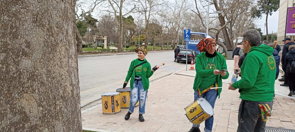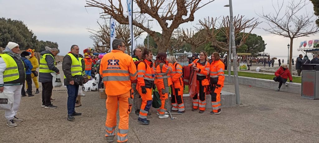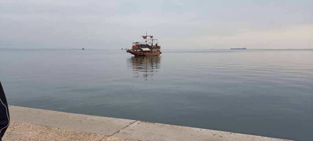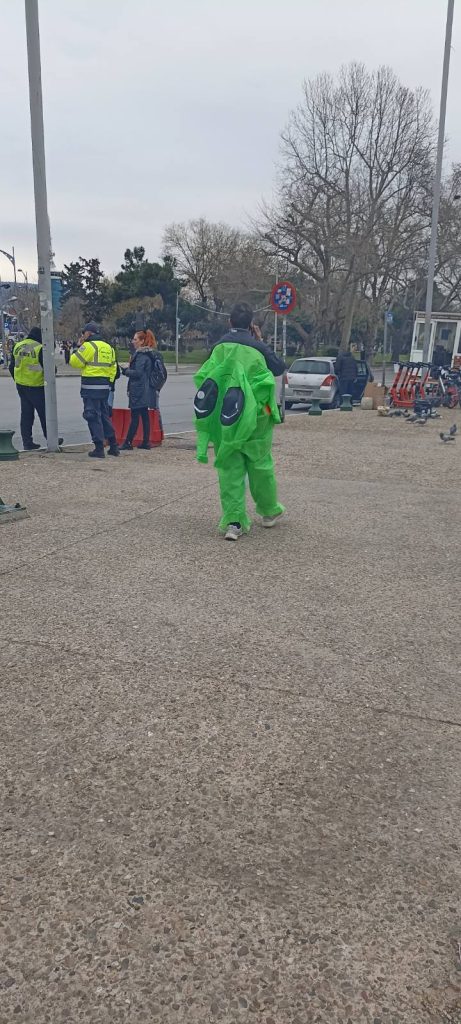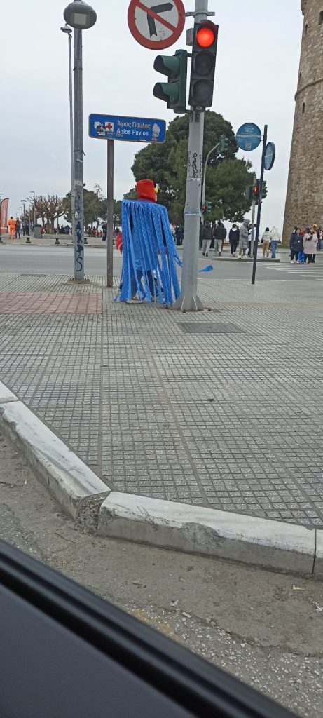 Αν και η προγραμματισμένη ώρα συνάντησης των καρναβαλιστικών ομάδων είχε ορισθεί στις 14:00, “χαλαρά” οι πρώτοι καρναβαλιστές έκαναν την εμφάνισή τους λίγο αργότερα. Για αυτό είπαμε να απολαύσουμε τη θέα στην παραλία και στην θάλασσα του Θερμαϊκού, που ήταν πραγματικά “σεντόνι”.