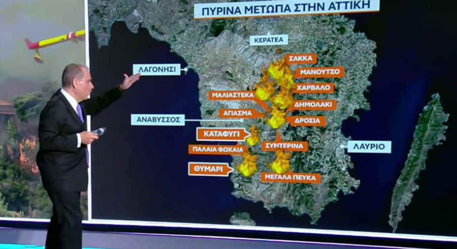“Είμαστε στην οδό Αγίας Φωτεινής…Έχει πιάσει τα πρώτα σπίτια πάνω στον βουνό και κατεβαίνει προς τα κάτω. Η φωτιά θα καταλήξει στα καμμένα, από την προηγούμενη φωτιά. Αν προχωρήσει, θα πάει στον οικισμό του Χάρακα και θα ξαναμπεί στον Δήμο Λαυρεωτικής. Απευχόμαστε να φθάσει στον Εθνικό Δρυμό”, ανέφερε μεταξύ άλλων ο κ. Πετρόπουλος μιλώντας στο έκτακτο δελτίο του OPEN.
