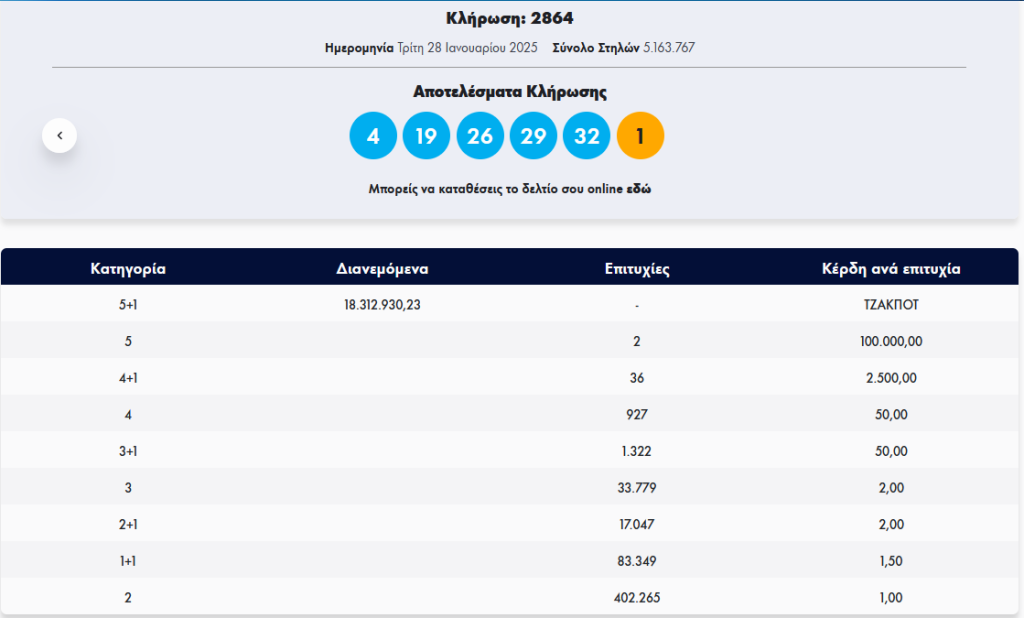 Στην κλήρωση 2864 του ΤΖΟΚΕΡ, την Τρίτη 28 Ιανουαρίου 2025, οι τυχεροί αριθμοί είναι: