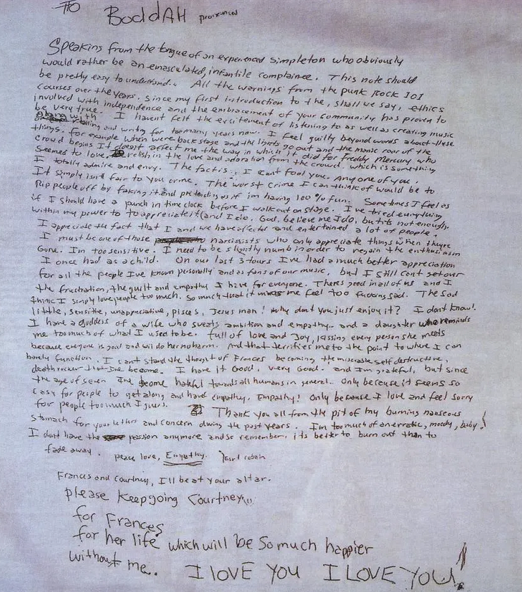 Ο Kurt Cobain, ο τραγουδιστής και ιδρυτικό μέλος του διάσημου συγκροτήματος “Nirvana”, αυτοκτόνησε στις 5 Απριλίου 1994, σε ηλικία 27 ετών. Το σώμα του βρέθηκε στις 8 Απριλίου στο σπίτι του στο Σιάτλ, όπου ο τραγουδιστής είχε τραύματα από κυνηγετικό όπλο και ένα σημείωμα αυτοκτονίας δίπλα του.