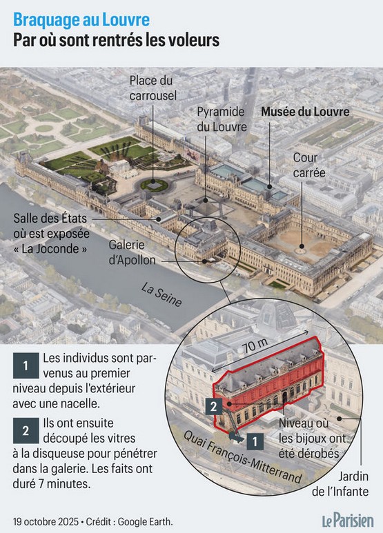 Σπάζοντας το παράθυρο του μουσείου, οι ληστές μέσα σε 7 μόλις λεπτά κατάφεραν να αρπάξουν από την αίθουσα Απόλλων, 9 πολύτιμα κοσμήματα ανυπολόγιστης αξίας και να διαφύγουν με μηχανή μεγάλου κυβισμού.