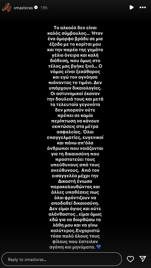 «Το αλκοόλ δεν είναι καλός σύμβουλος. Ένα όμορφο ταξίδι σε μία έξοδο με το κορίτσι μου και την παρέα της γεμάτο γέλιο όνειρα και καλή διάθεση, που όμως στο τέλος μας βγήκε ξινό. Ο νόμος είναι ξεκάθαρος και εγώ τον αγνόησα πιάνοντας το τιμόνι. Δεν υπάρχουν δικαιολογίες.