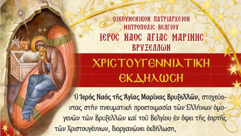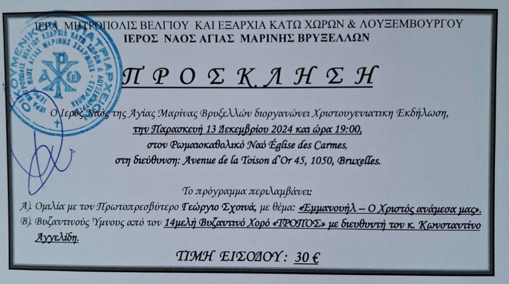 Ο Ιερός Ναός της Αγίας Μαρίνας Βρυξελλών, στοχεύοντας στην πνευματική προετοιμασία των Ελλήνων ομογενών των Βρυξελλών και του Βελγίου εν όψει της εορτής των Χριστουγέννων, διοργανώνει εκδήλωση, την Παρασκευή 13 Δεκεμβρίου 2024 και ώρα 19:00, στον Ρωμαιοκαθολικό Ναό Église des Carmes (Avenue de la Toison d’Or 45, 1050 Bruxelles), η οποία θα περιλαμβάνει: