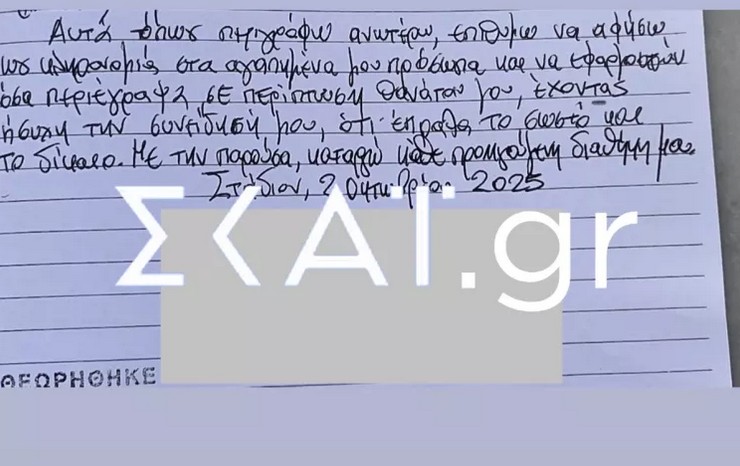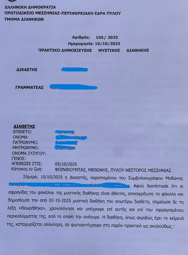 - Τρίτος κληρονόμος ορίζεται η ανιψιά του 68χρονου, η οποία κληρονομεί ένα μικρό χρηματικό ποσό.