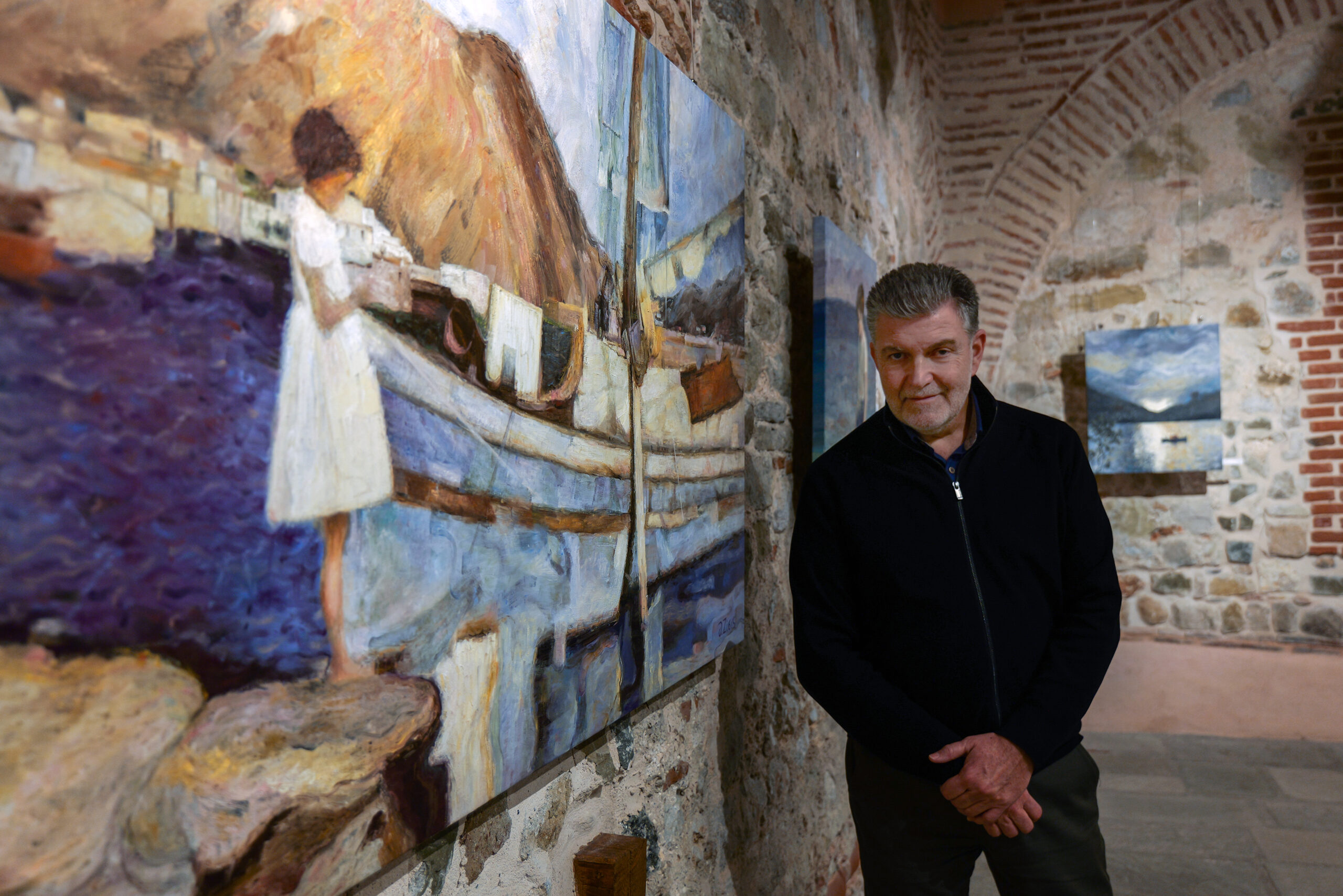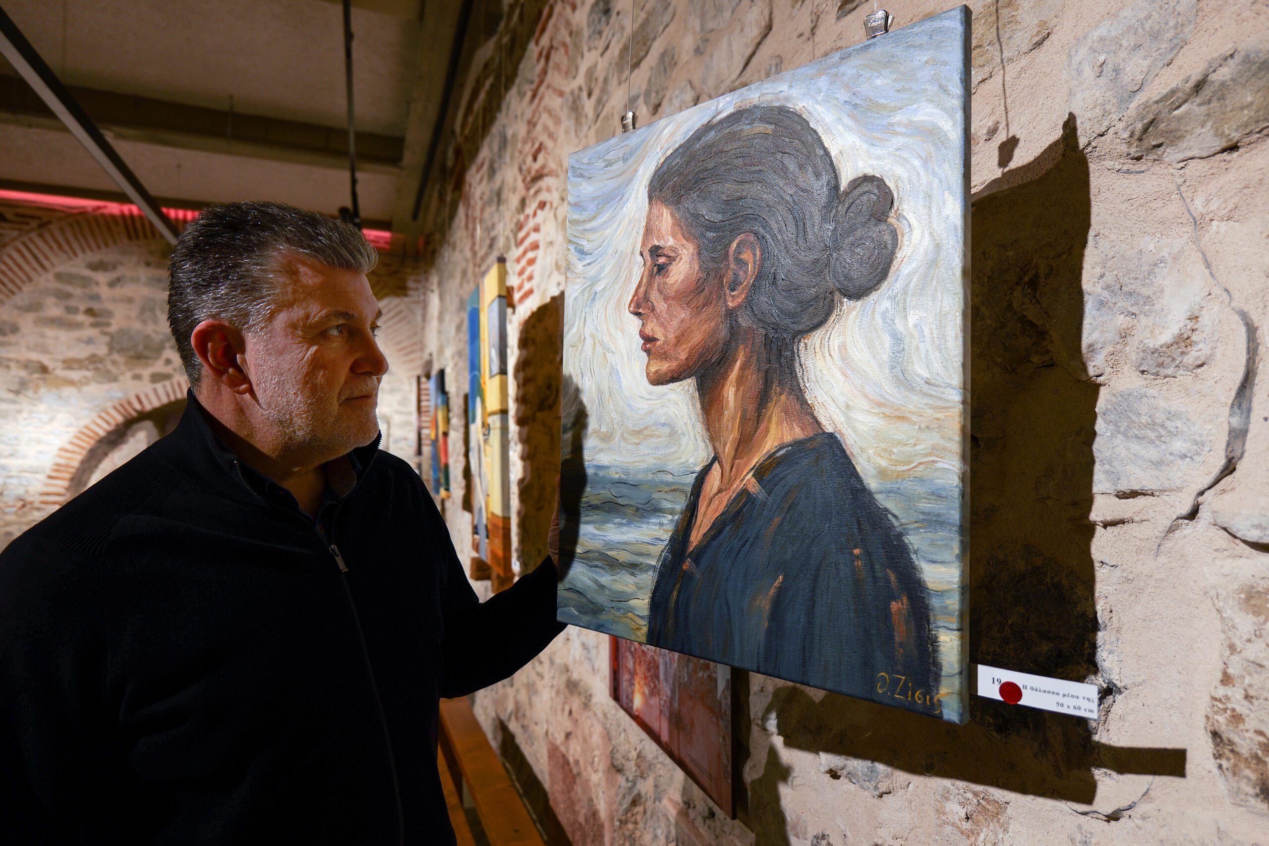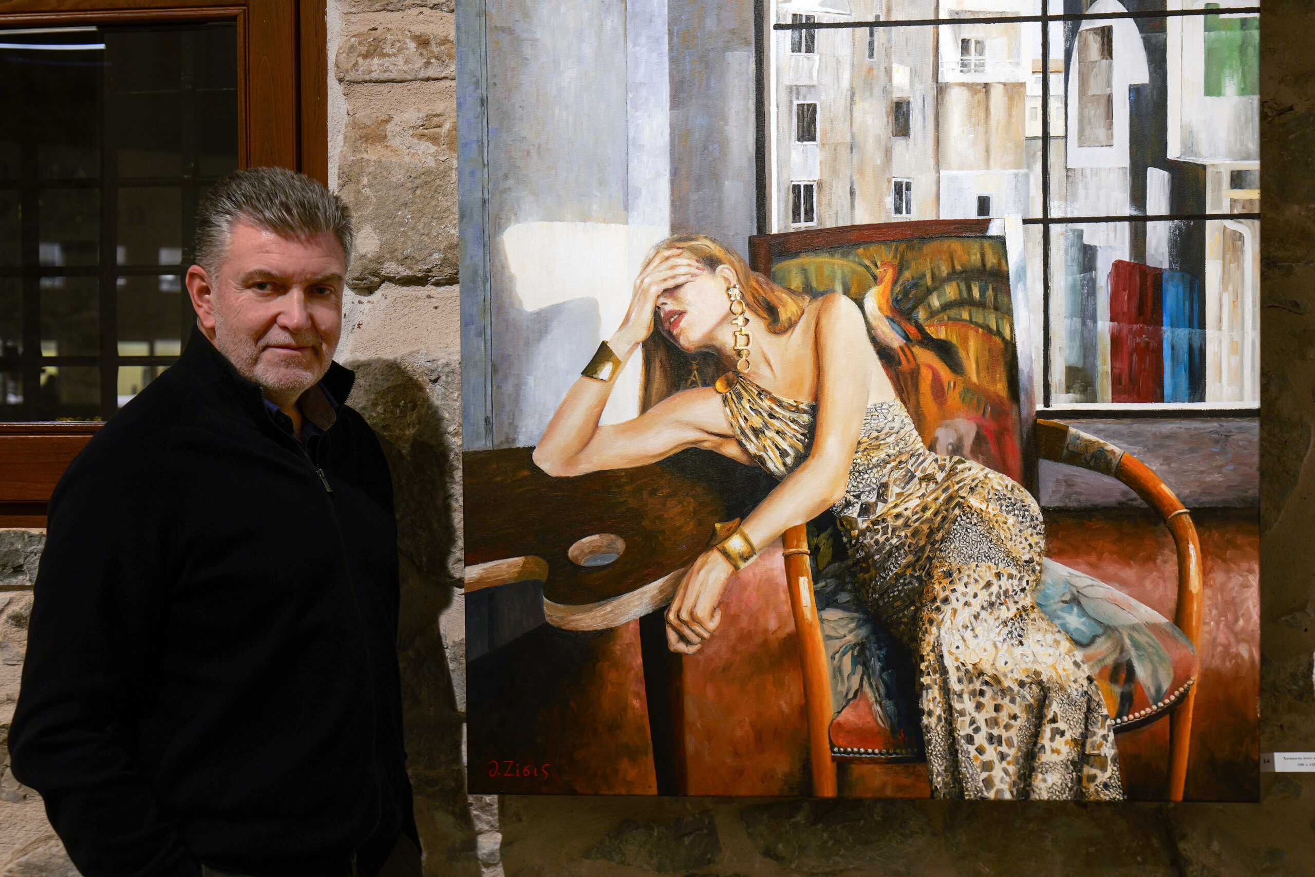 Thanasis Zisis, né à Trikala en 1963, enseignant de Physique et d’Informatique et peintre autodidacte, transfère dans ses œuvres cette double identité : la précision du scientifique et la liberté de l’artiste. Le titre « Après les physiques » n’est pas fortuit – il fait référence non seulement à la philosophie antique d’Aristote, mais aussi au parcours personnel du peintre au-delà des données « physiques » de la science, vers le métaphysique, l’émotionnel et l’onirique.