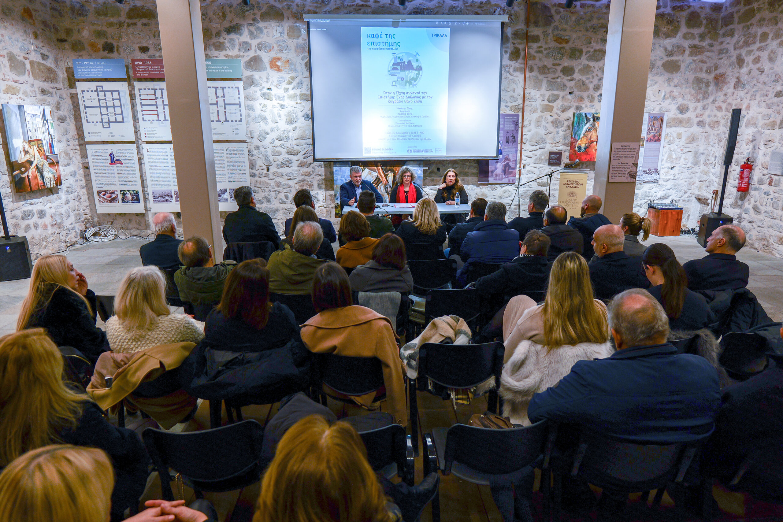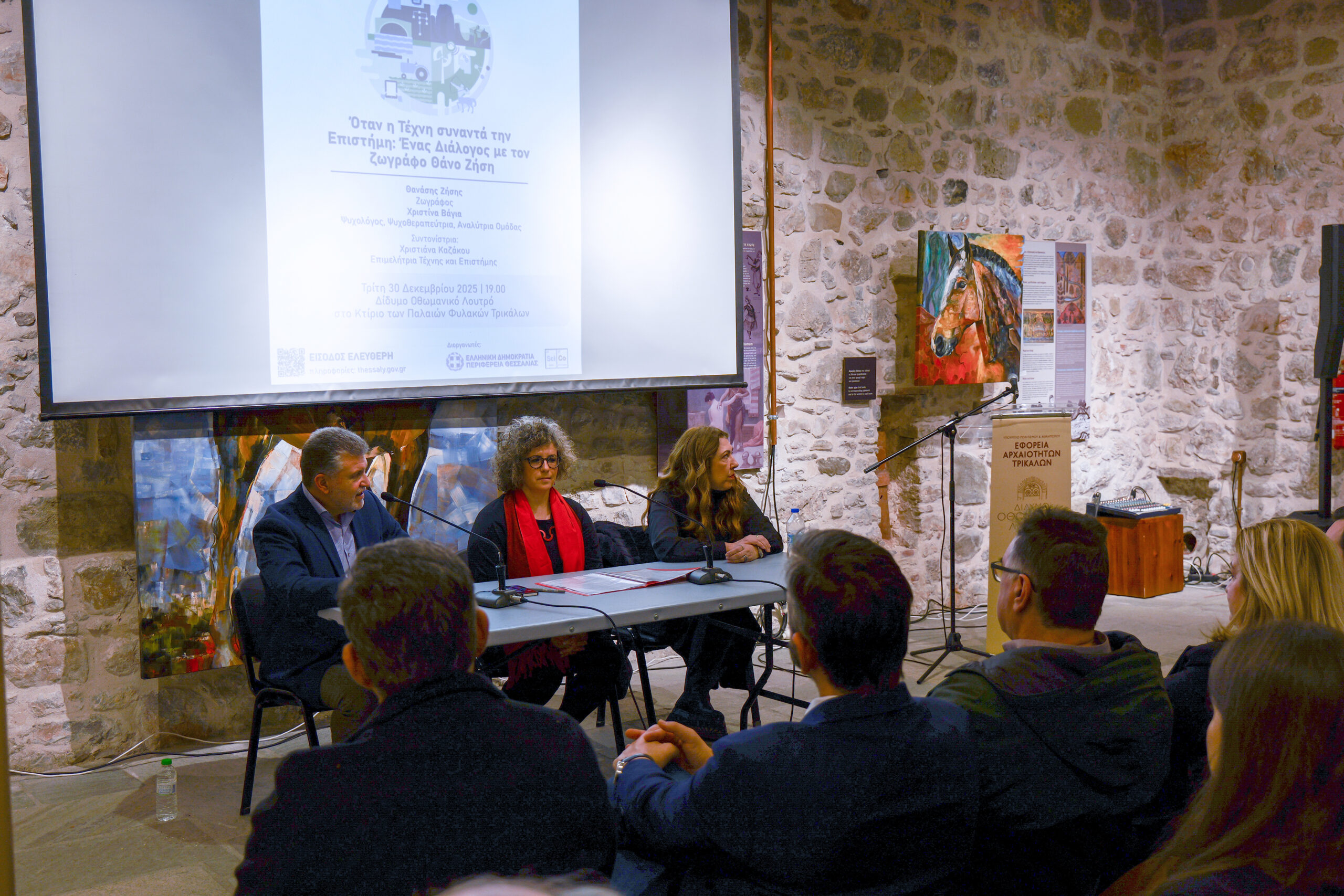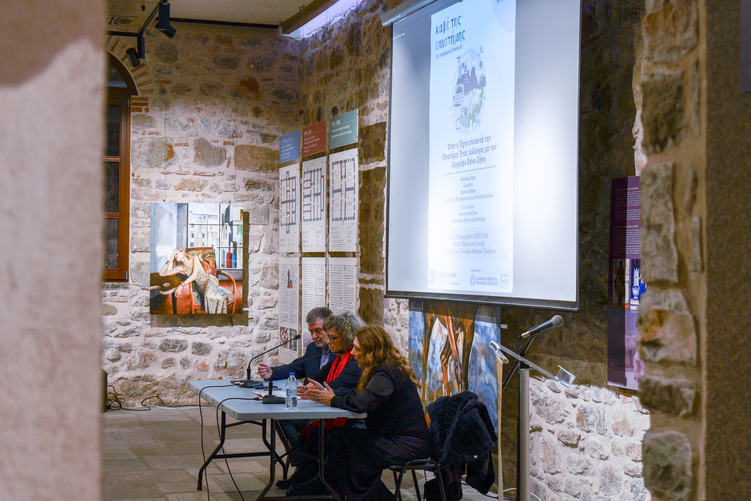 Le vernissage a eu lieu le 20 décembre 2025, en présence d’un public nombreux, et a été accompagné d’un événement spécial le 30 décembre, au cours duquel l’artiste a échangé avec le public sur la rencontre fructueuse entre art et science, dans le cadre du « Café de la Science » de la région de Thessalie.