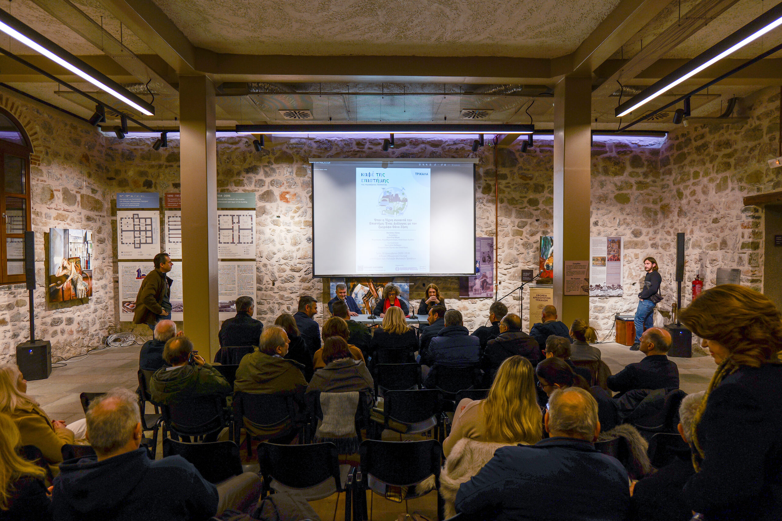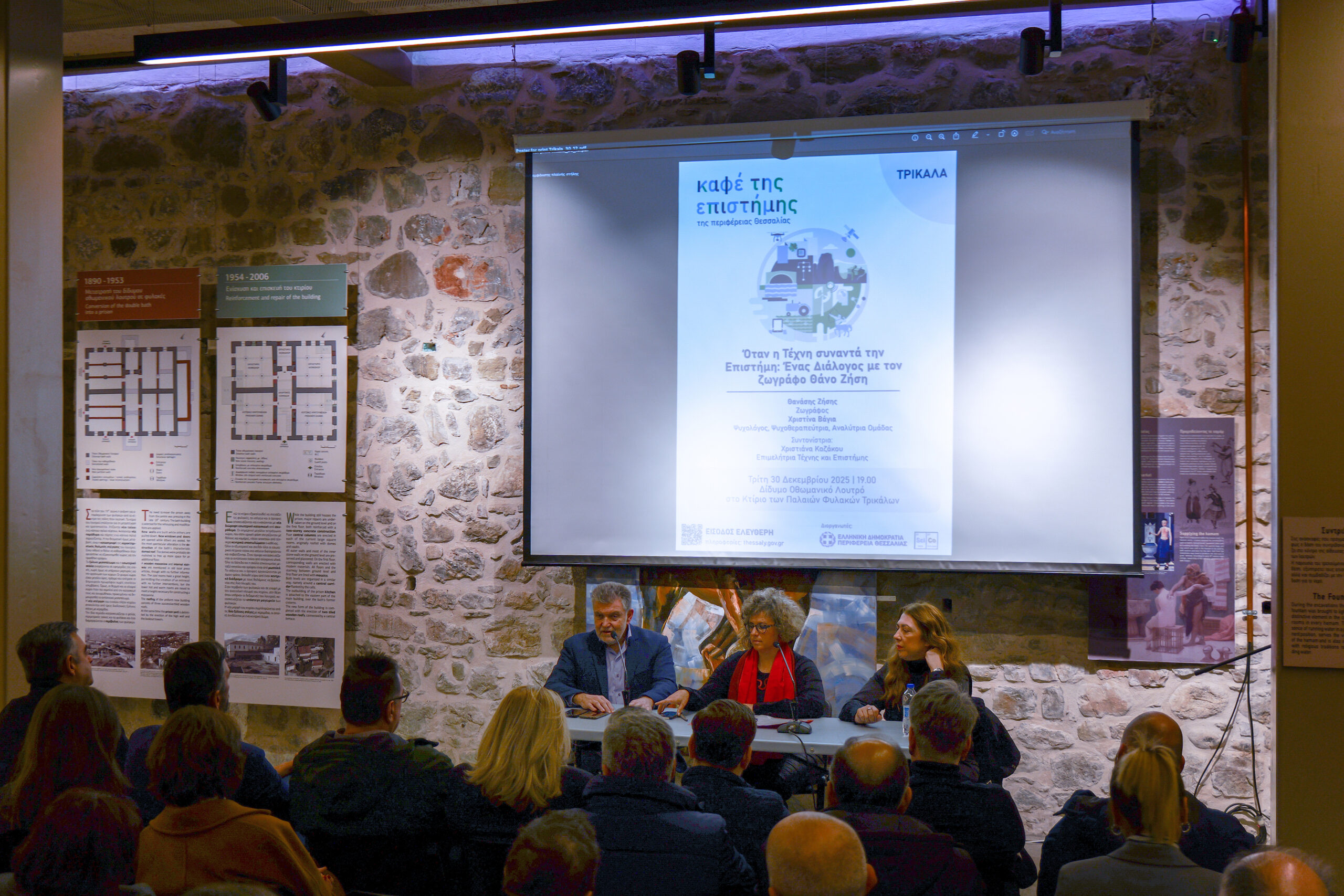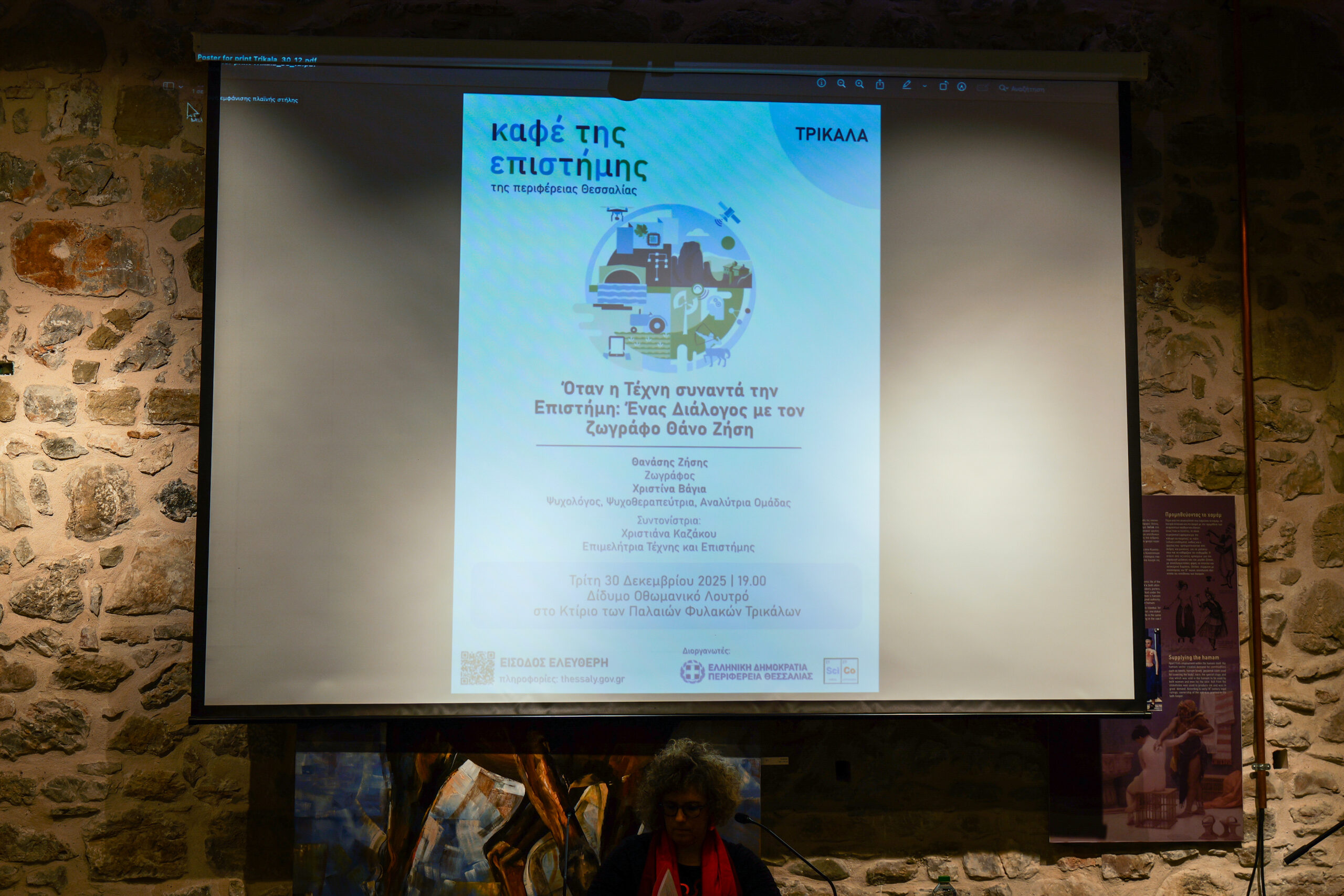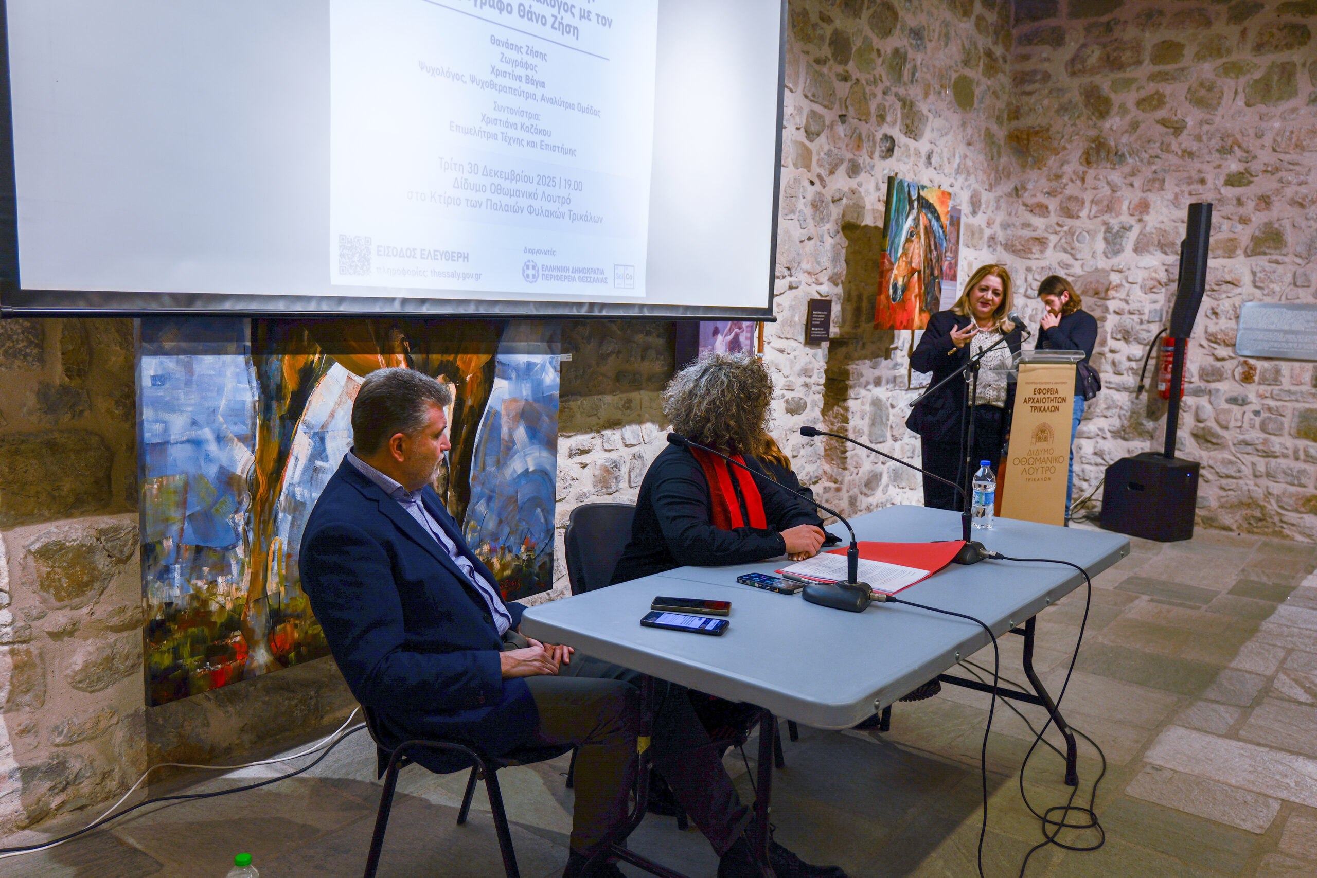 Le vernissage a eu lieu le 20 décembre 2025, en présence d’un public nombreux, et a été accompagné d’un événement spécial le 30 décembre, au cours duquel l’artiste a échangé avec le public sur la rencontre fructueuse entre art et science, dans le cadre du « Café de la Science » de la région de Thessalie.