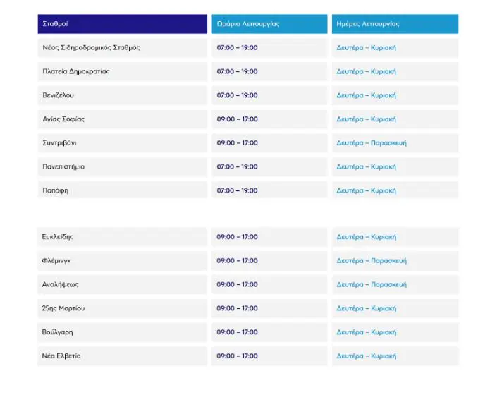 Τα εκδοτήρια σε τρεις σταθμούς θα λειτουργούν Δευτέρα έως Παρασκευή, ενώ στους υπόλοιπους δέκα σταθμούς θα λειτουργούν Δευτέρα έως Κυριακή.
