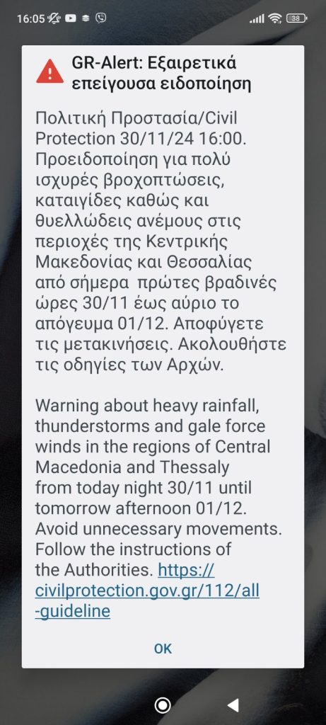 “ Πολιτική Προστασία/Civil Protection 30/11/24 16:00.Προειδοποίηση για πολύ ισχυρές βροχοπτώσεις, καταιγίδες καθώς και θυελλώδεις ανέμους στις περιοχές της Κεντρικής Μακεδονίας και Θεσσαλίας, από σήμερα πρώτες βραδινές ώρες 30/11 έως αύριο το απόγευμα 01/12.