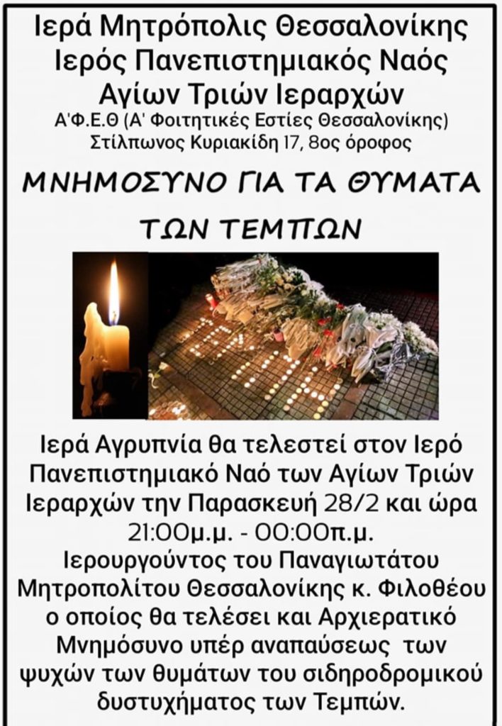 Σε κλίμα βαθιάς συγκίνησης και πνευματικής κατάνυξης, η Ιερά Μητρόπολη Θεσσαλονίκης διοργανώνει μνημόσυνο για τα θύματα του σιδηροδρομικού δυστυχήματος των Τεμπών.