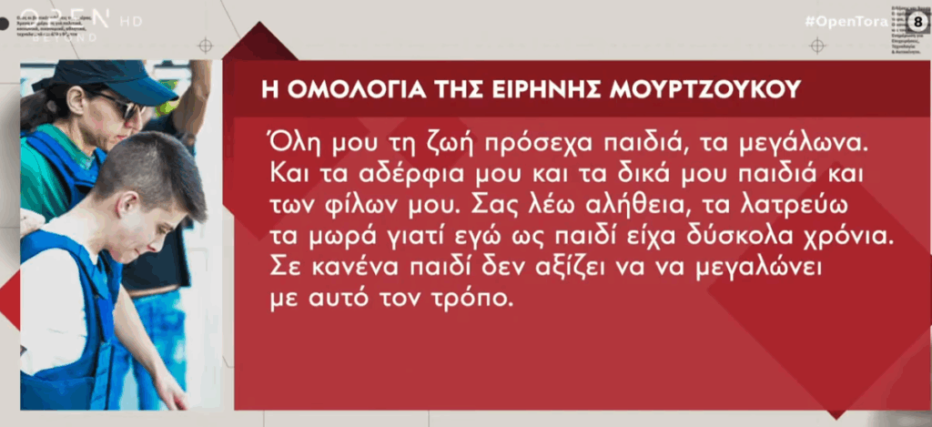 «Εγώ μια ζωή μεγάλωνα παιδιά, τα αδέρφια μου, των φίλων μου, τα δικά μου. Τα λατρεύω τα μωρά, σας το λέω αλήθεια. Και τα λατρεύω γιατί εγώ ως παιδί πέρασα δύσκολα. Δεν αξίζει σε κανένα παιδί να μεγαλώνει άσχημα. Εγώ πάντα ονειρευόμουν μία ωραία οικογένεια και ποτέ δεν την είχα. Και κοιτάξτε που έφτασα, να κάνω κακό στα δικά μου τα παιδιά, στην αδερφή μου και σε ένα άλλο αθώο μωρό, εννοώ της Κατερίνας».