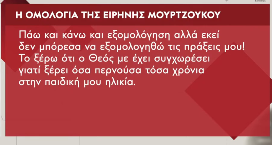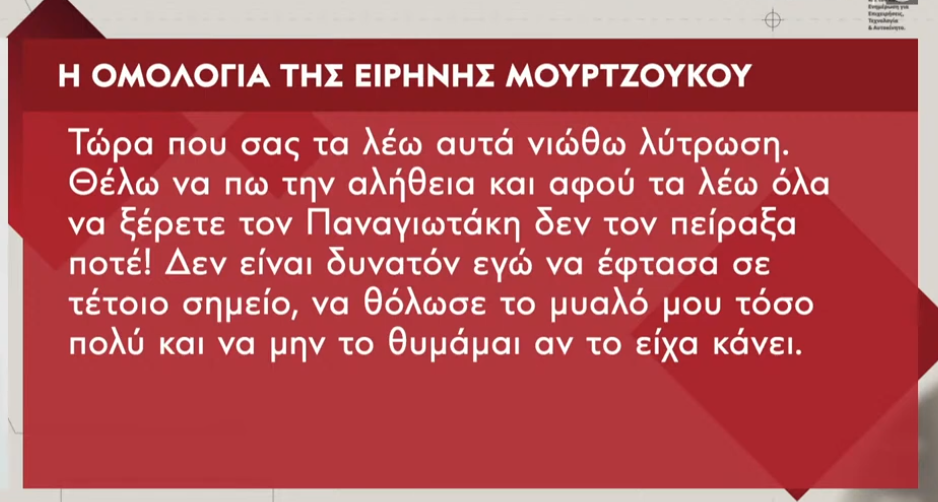 Κατά την ομολογία της στη ΓΑΔΑ, η Ειρήνη Μουρτζούκου, αρνείται ότι δολοφόνησε τον μικρό Παναγιωτάκη.