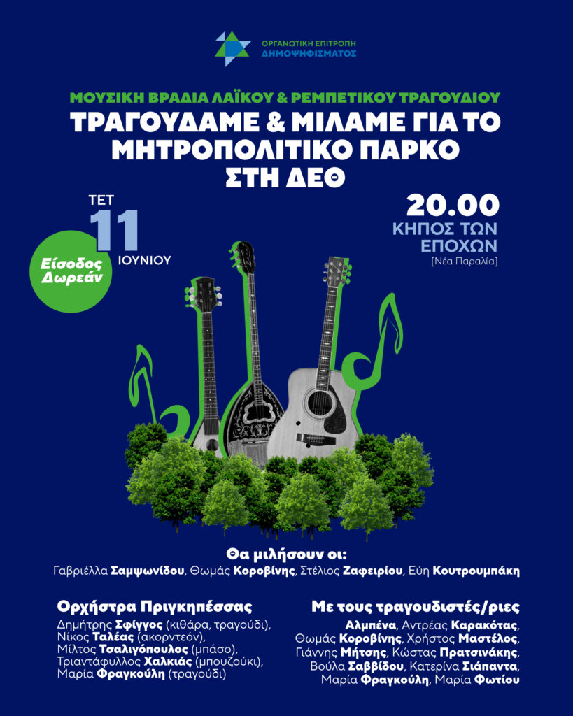 Μουσικοί, τραγουδιστές/τριες, συνθέτες και δημιουργοί της πόλης ενώνουν τη φωνή τους και προσφέρουν την τέχνη τους ανιδιοτελώς συμβάλλοντας στη μεγάλη προσπάθεια ν’ ακουστεί η φωνή των κατοίκων της πόλης, που διεκδικούν Μητροπολιτικό πάρκο στον χώρο της ΔΕΘ. Η εκδήλωση θα πραγματοποιηθεί στις 8 το βράδυ, στο Αμφιθέατρο του Κήπου των Εποχών, στη Νέα Παραλία (στάση Σχολή Τυφλών).