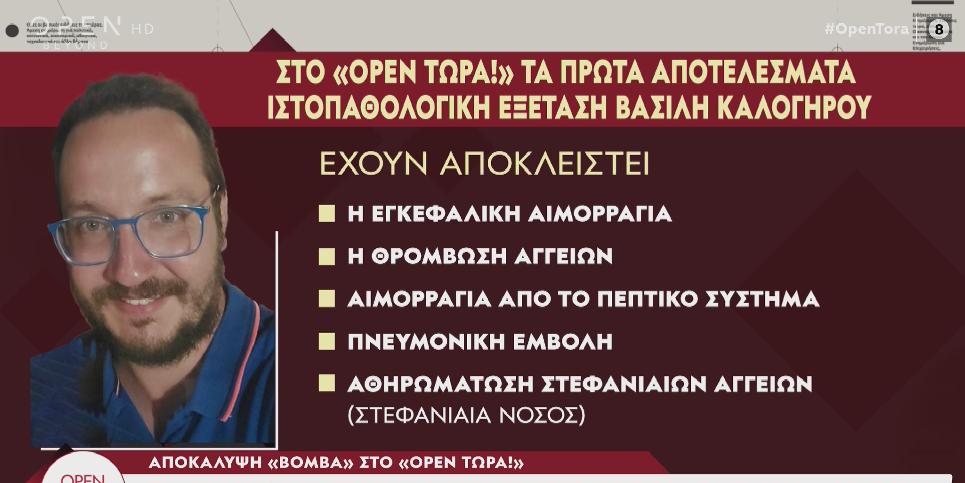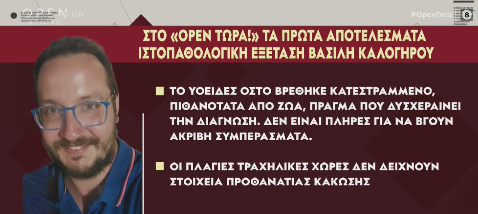 Όπως αποκάλυψε η εκπομπή “OPEN ΤΩΡΑ”, το μεσημέρι της Πέμπτης (03/04), τα πρώτα αποτελέσματα της ιστοπαθολογικής εξέτασης του Καλογήρου από εργαστήριο της Θεσσαλονίκης αποκλείει ουσιαστικά τον παθολογικό θάνατο και αφήνει ανοιχτό το ενδεχόμενο εγκληματικής ενέργειας.