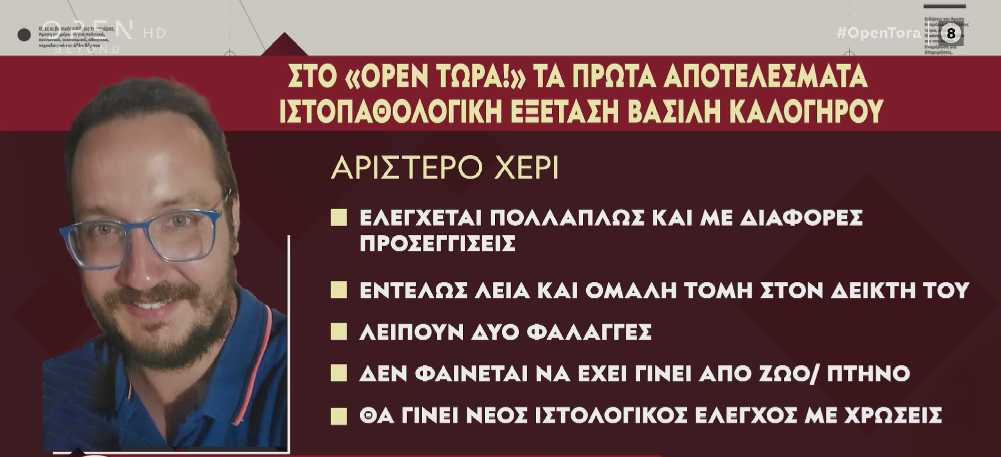 Σύμφωνα με το αποκλειστικό ρεπορτάζ του δημοσιογράφου της εκπομπής, Νίκου Νικολετάκη, πολλά ερωτηματικά έχει εγείρει η κατάσταση του αριστερού χεριού του Βασίλη Καλογήρου. Συγκεκριμένα πρόκειται για την τομή στο δάχτυλο, η οποία είναι λεία, αποκλείοντας έτσι την περίπτωση να έχει προκληθεί από κάποιο ζώο ή πτηνό.