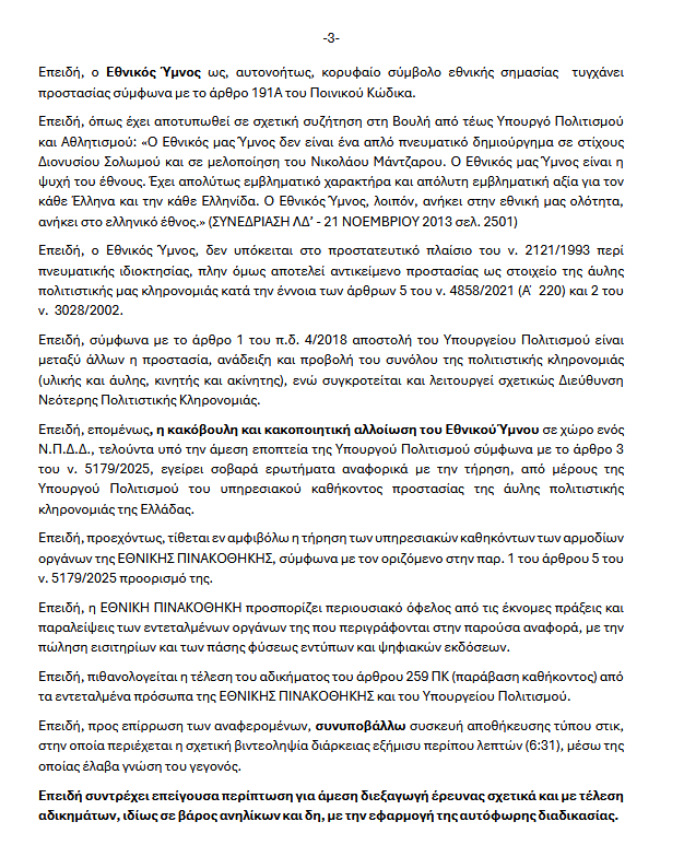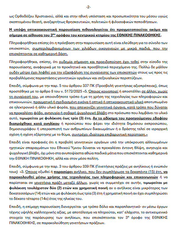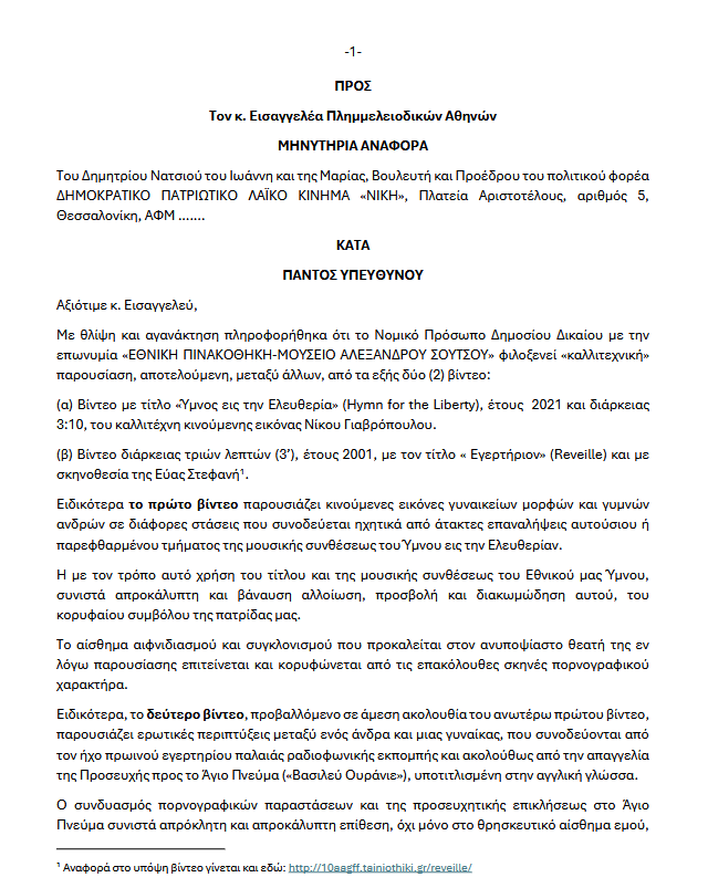 Μηνυτήρια αναφορά για την έκθεση νέου έργου στην Εθνική Πινακοθήκη κατέθεσε σήμερα στην Εισαγγελία Πλημμελειοδικών Αθηνών, ο πρόεδρος της Νίκης Δημήτριος Νατσιός.