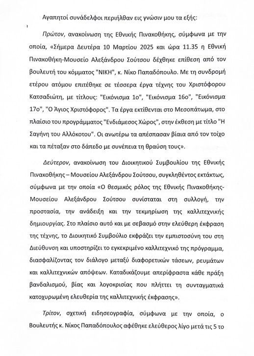 Με περικοπή κατά 1/2 της βουλευτικής του αποζημίωσης τιμωρήθηκε ο βουλευτής Β’ Θεσσαλονίκης της «Νίκης» Νίκος Παπαδόπουλος, για τις ζημιές που προκάλεσε σε εκθέματα της Εθνικής Πινακοθήκης.