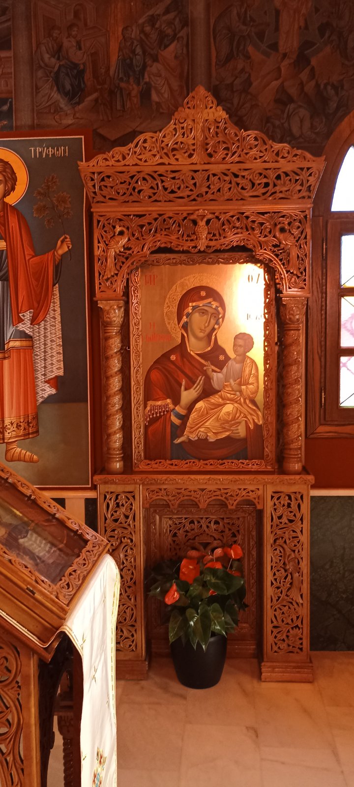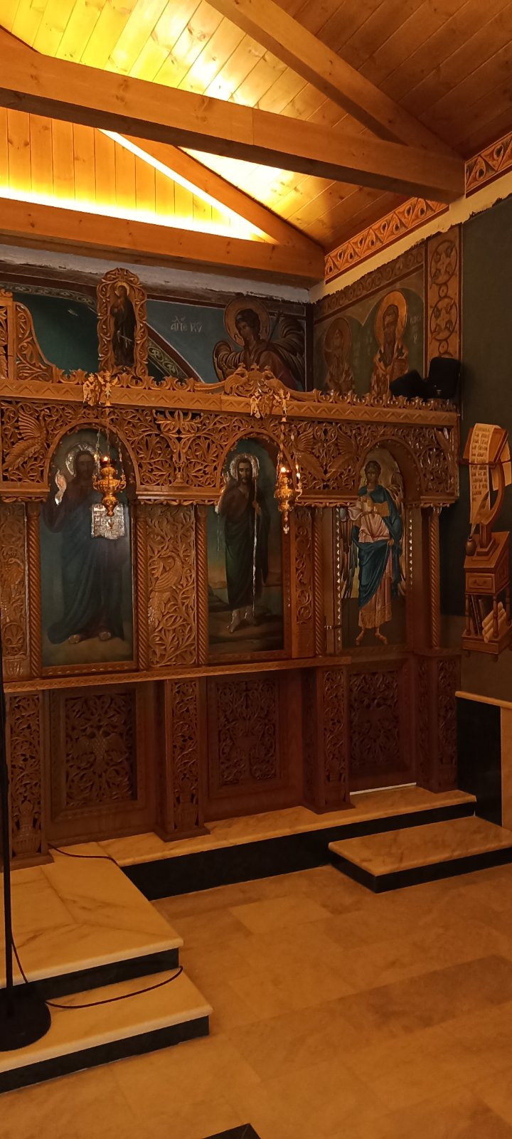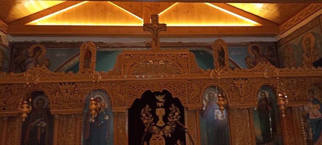Μπαίνοντας στο εσωτερικό ναού, από τον νάρθηκα σε κατακλύζει η μυρωδιά που ξύλου λόγω του αρχιτεκτονικού διάκοσμου. Εντυπωσιακό είναι το ξύλινο σκαλιστό τέμπλο με τις ιερές εικόνες ενώ ολόκληρος ο ναός είναι διακοσμημένος με τοιχογραφίες Αγίων.