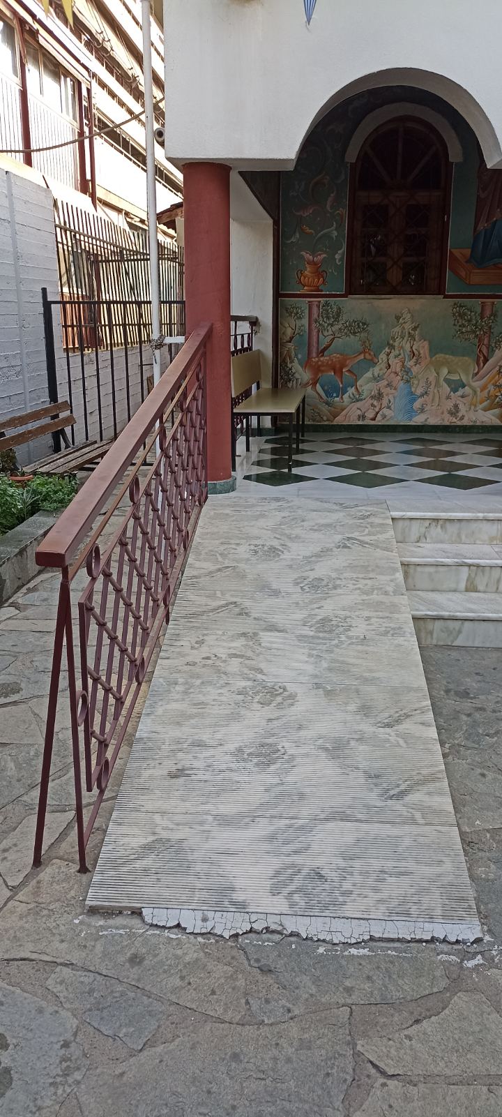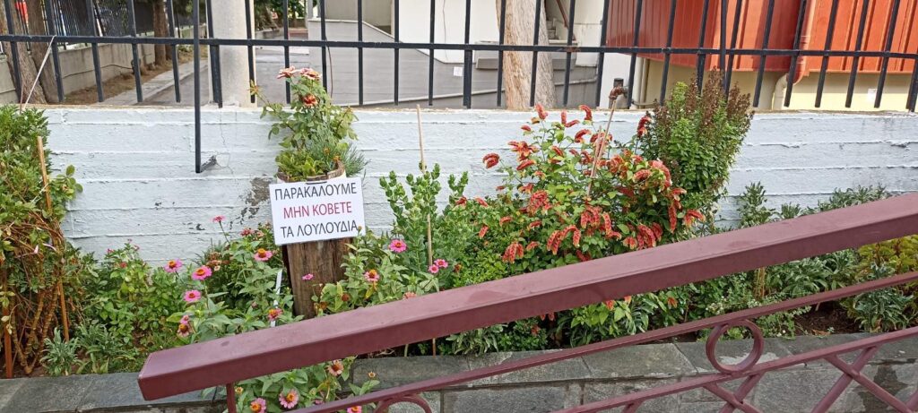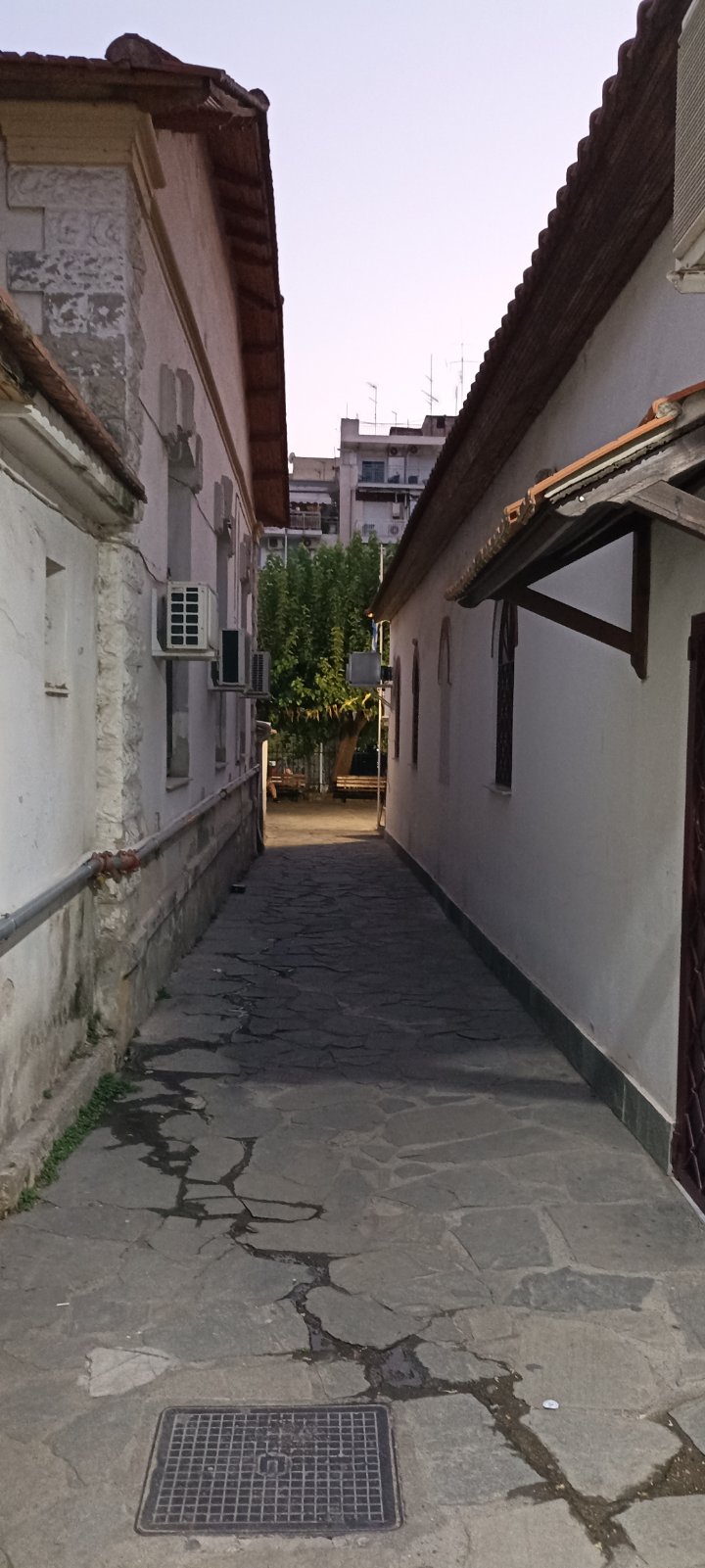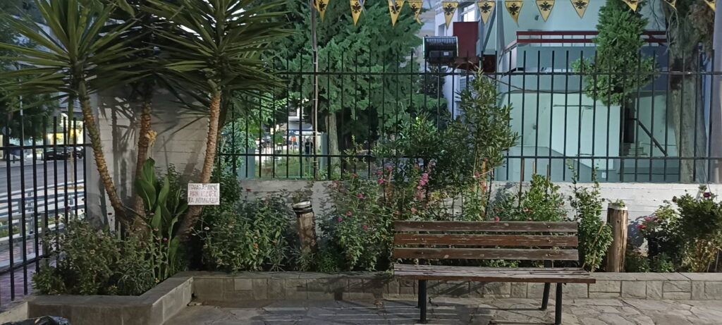 Ο προαύλιος χώρος του Αγίου Παντελεήμονα είναι πλακόστρωτος και περιμετρικά τα δέντρα και τα παρτέρια με τα λουλούδια δίνουν την αίσθηση στον επισκέπτη/πιστό ότι βρίσκεται σε εκκλησία κάποιου χωριού παρά μέσα στην “καρδιά” του αστικού ιστού της Θεσσαλονίκης.