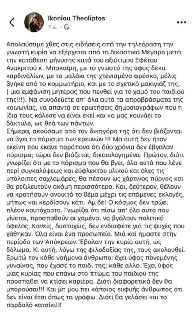 2 thoughts on “O Μητροπολίτης Ικονίου Θεόκλητος και η ανάρτηση – λίβελος για τη Μαρία Καρυστιανού”