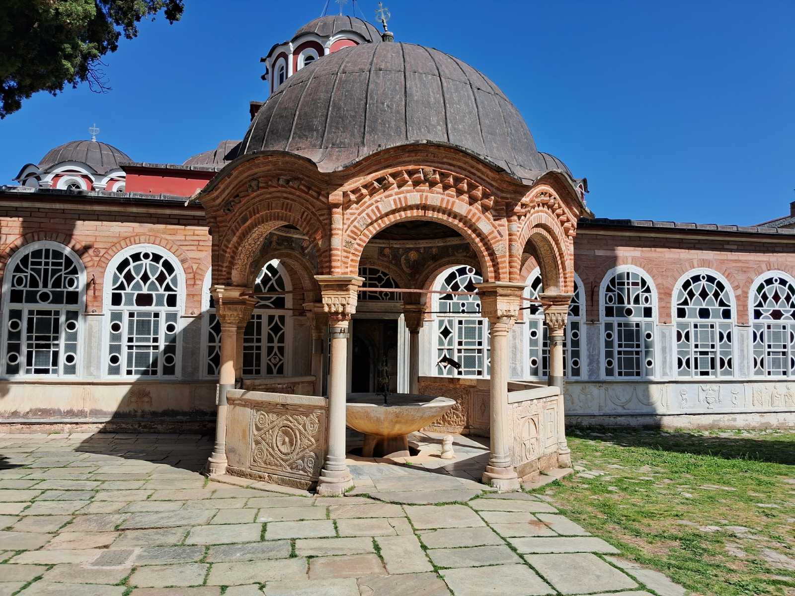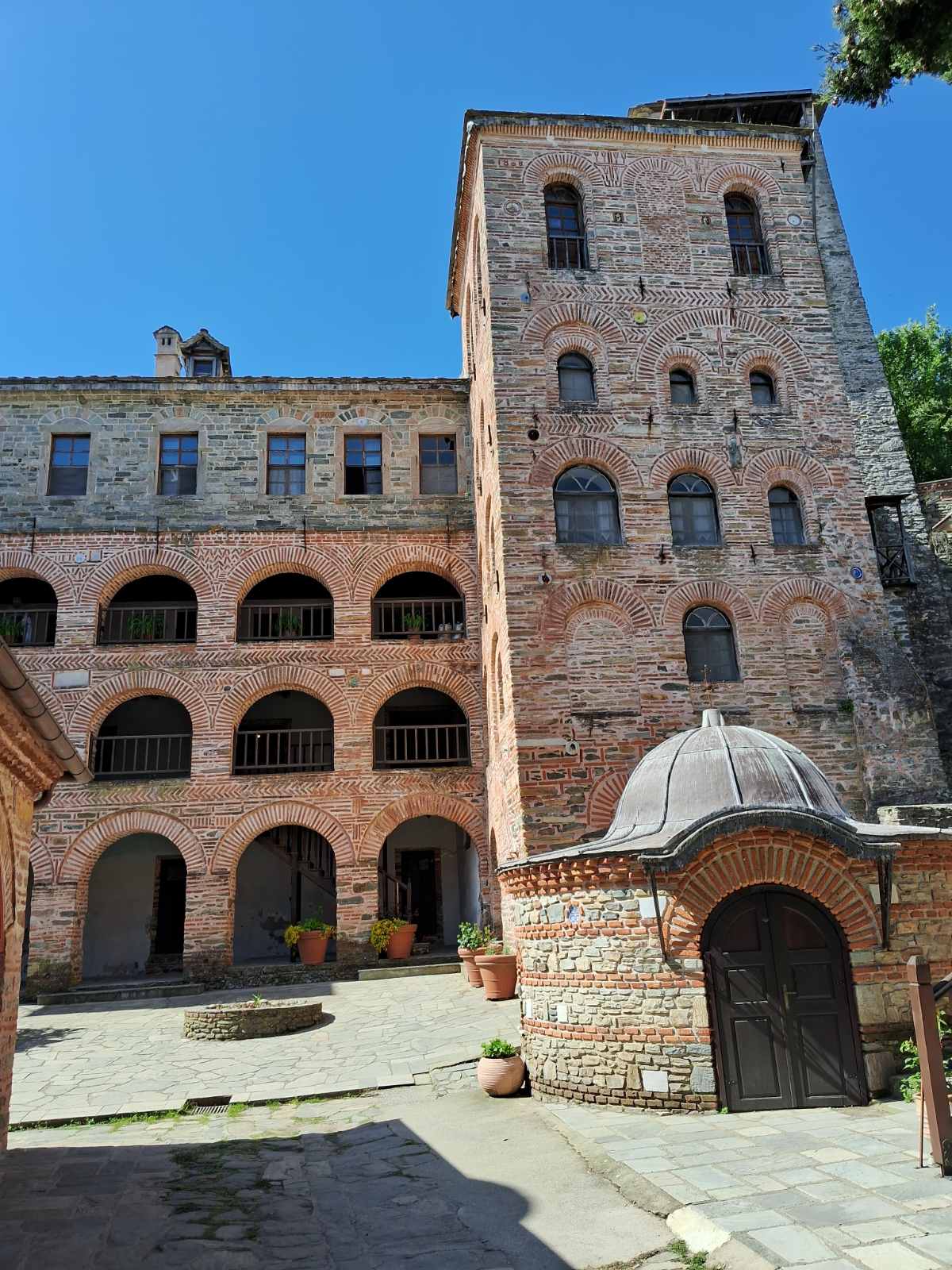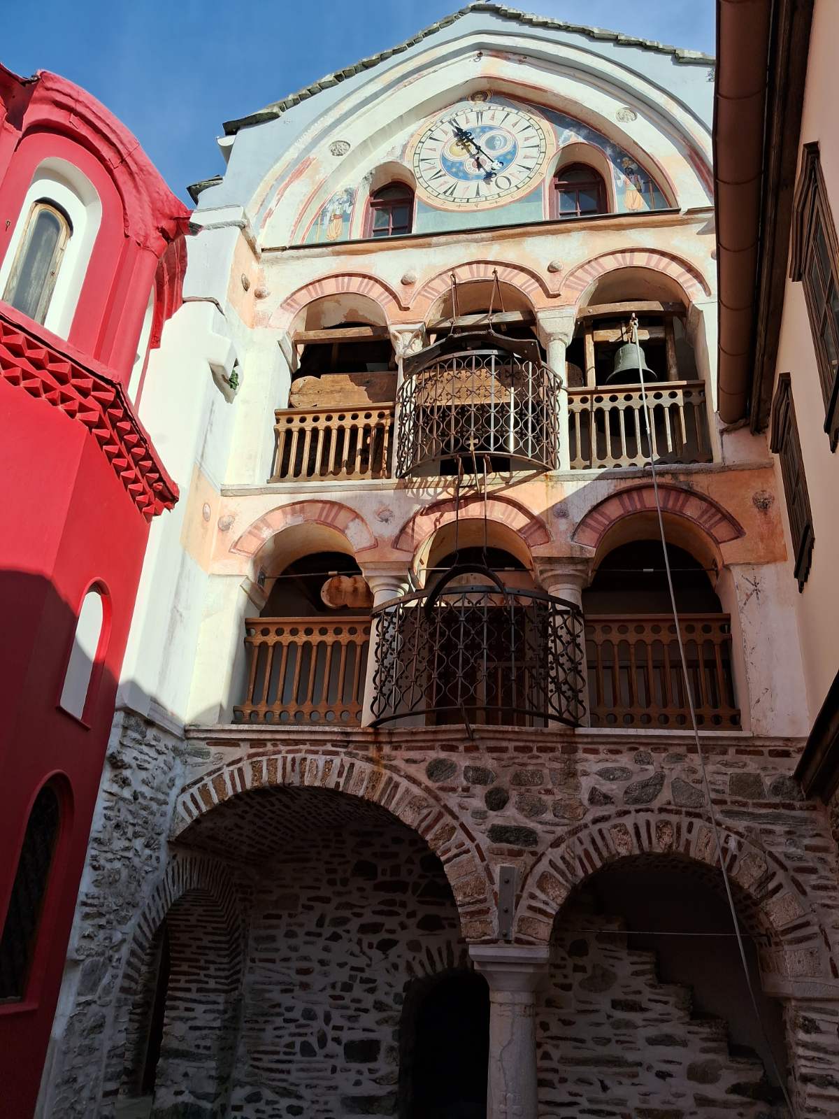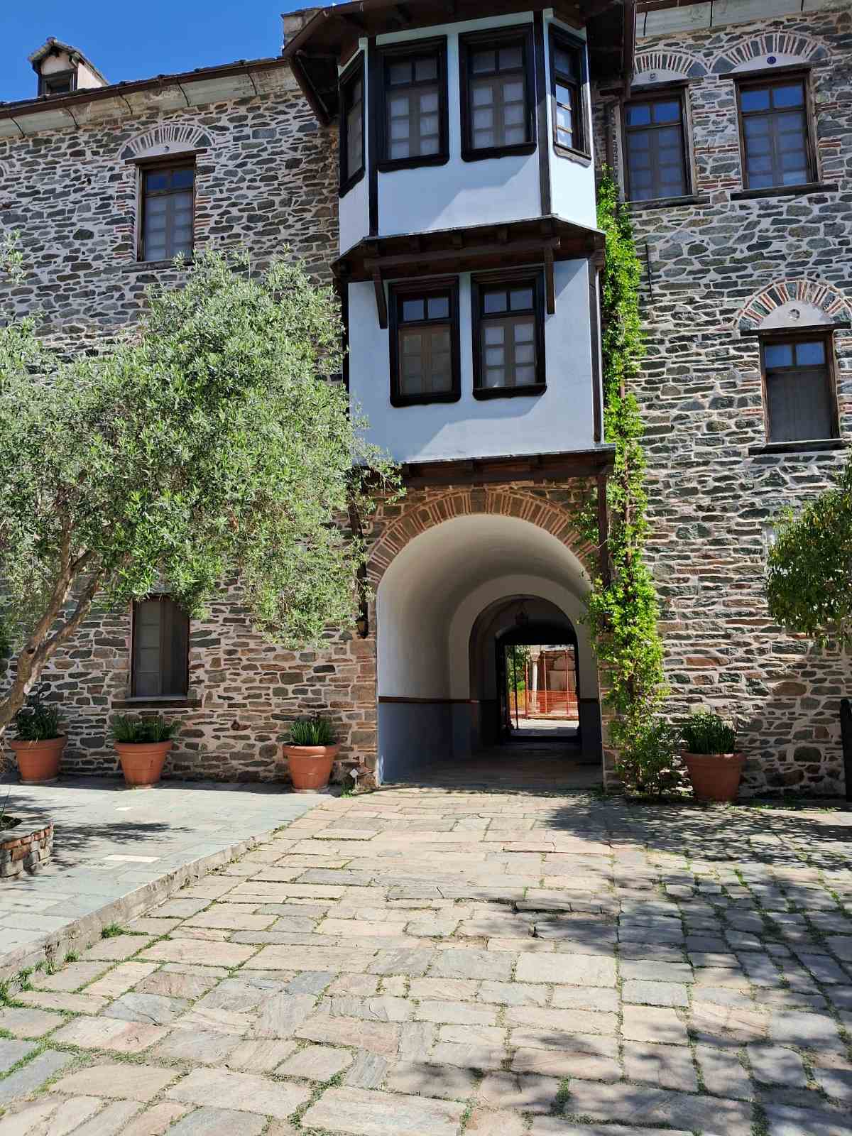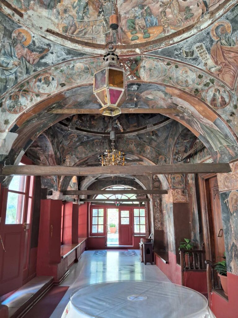 The refectory located opposite the main entrance of the Katholikon is the largest in size on Mount Athos. Its interior bears frescoes by Theophanes and were made at the expense of Metropolitan Gennadios of Serres.