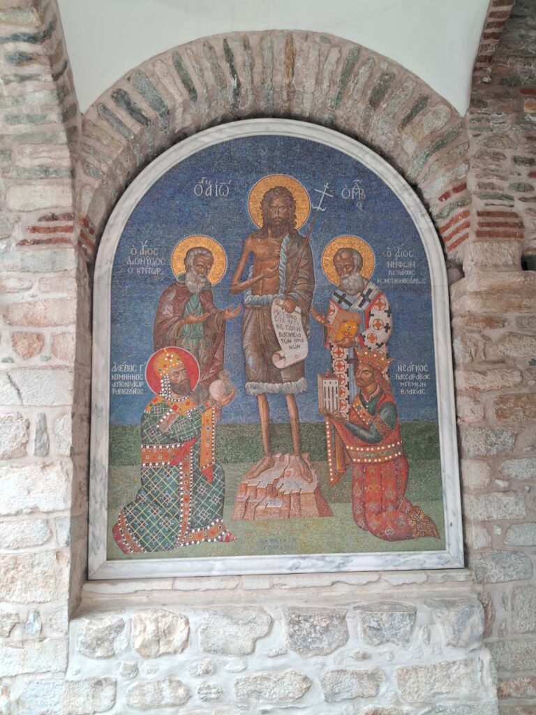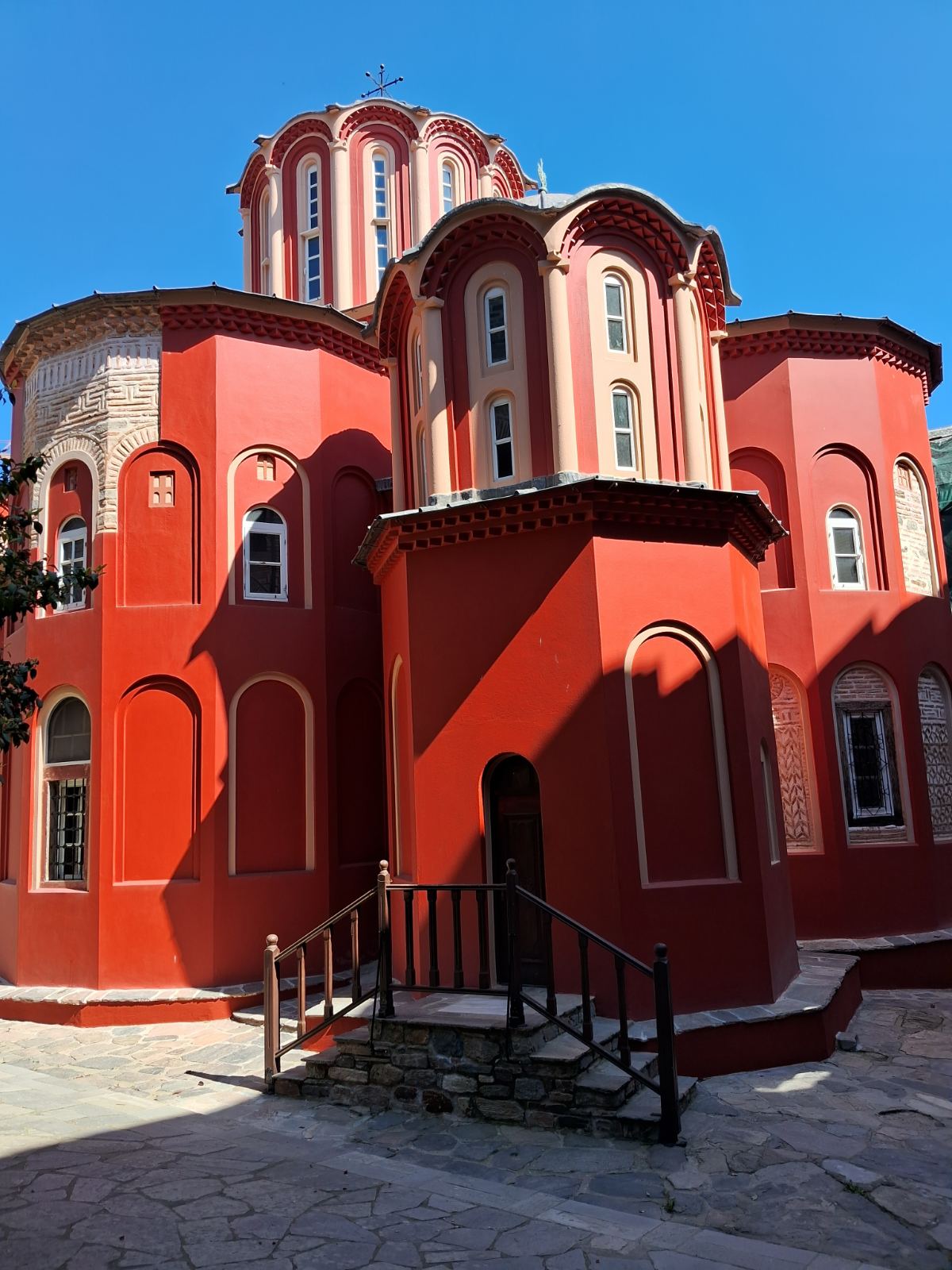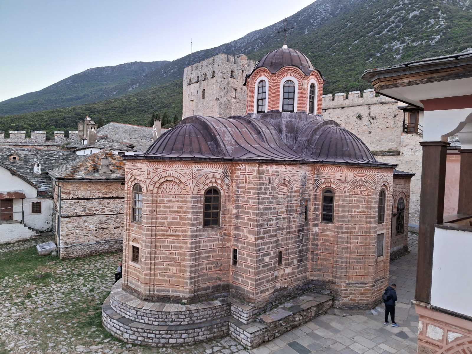 The Katholikon was founded by Saint Athanasius who lost his life along with 6 other craftsmen when a dome fell during construction.