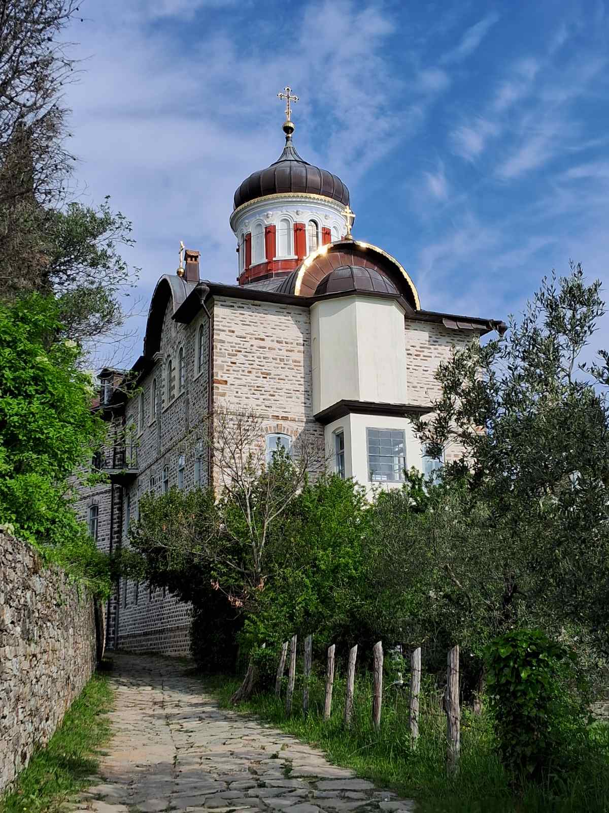 The Holy Monastery of Saint Panteleimon, otherwise known as the Russian Monastery, is located in the southwest of the Athos peninsula, just before the port of Dafni and at a distance of one hour from the Holy Monastery of Xenophon.