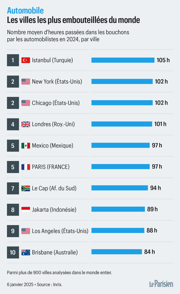 Η αμερικανική εταιρεία στατιστικών οδικής κυκλοφορίας μας πληροφορεί ότι οι παριζιάνοι πέρασαν κατά μέσο όρο 97 ώρες σε μποτιλιαρίσματα τον περασμένο χρόνο, κάτι που ισοδυναμεί με περισσότερο από τέσσερις ημέρες σε αναμονή στο τιμόνι.