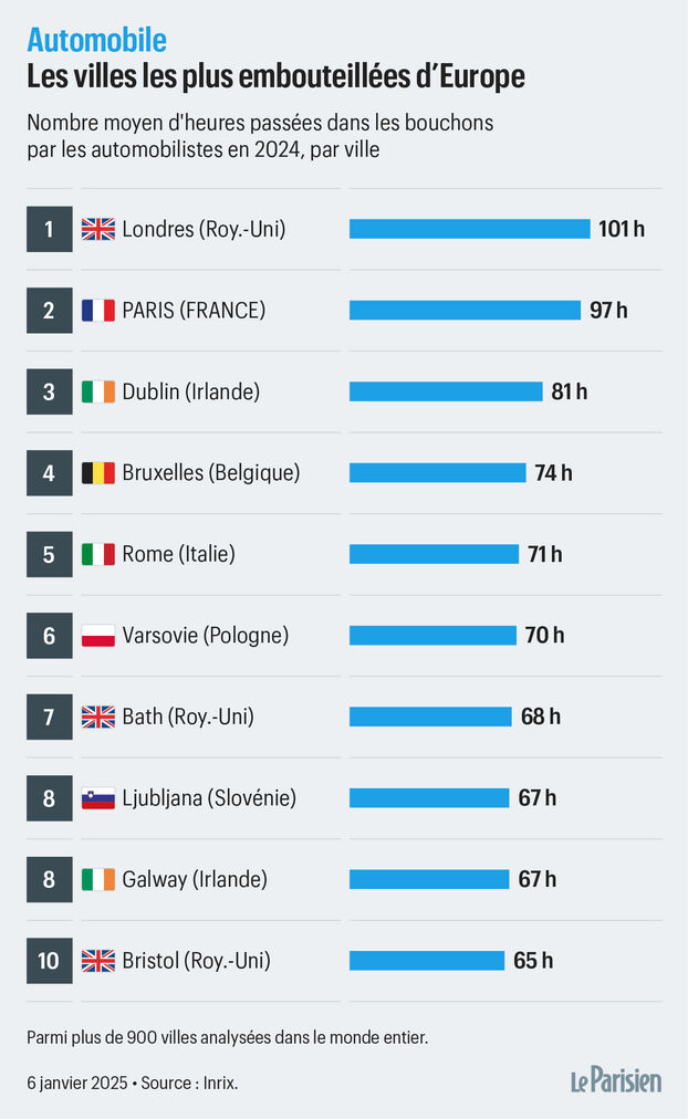 Την ίδια στιγμή, οι Λονδρέζοι κρατούν τα σκήπτρα της …”κίνησης” με 101 ώρες πίσω από το βολάν. Το Λονδίνο βρίσκεται στην κορυφή αυτής της ευρωπαϊκής κατάταξης για τέταρτη συνεχή χρονιά. Το Λονδίνο και το Παρίσι ακολουθεί το Δουβλίνο, οι Βρυξέλλες και η Ρώμη στην 3η 4η και 5η θέση αντίστοιχα.