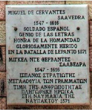 Εκεί λοιπόν, άσπονδε φίλε μου Λόπε, στα ελληνικά νερά της Ναυπάκτου, στη μεγαλύτερη ναυμαχία της εποχής μας, εκεί όπου για πρώτη φορά σταματήσαμε τους Τούρκους στη Μεσόγειο, εκεί γεννήθηκε ο Δον Κιχότης μου. Ανάβλυσε από τις πληγές μου, από το όνειρό μου, που ήταν και το όνειρο της χριστιανικής Ευρώπης, της ελευθερίας και του ανθρωπισμού.