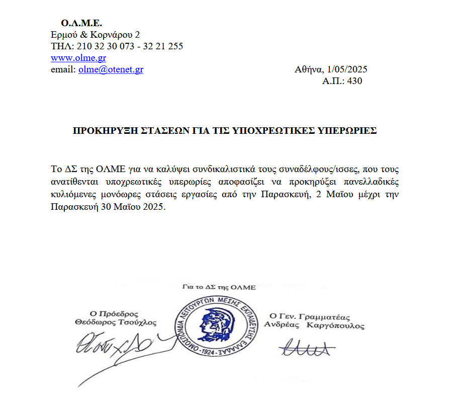 “Το ΔΣ της ΟΛΜΕ για να καλύψει συνδικαλιστικά τους συναδέλφους/ισσες, που τους ανατίθενται υποχρεωτικές υπερωρίες αποφασίζει να προκηρύξει πανελλαδικές κυλιόμενες μονόωρες στάσεις εργασίες από την Παρασκευή, 2 Μαϊου μέχρι την Παρασκευή, 30 Μαϊου 2025”, αναφέρεται στην ανακοίνωση.